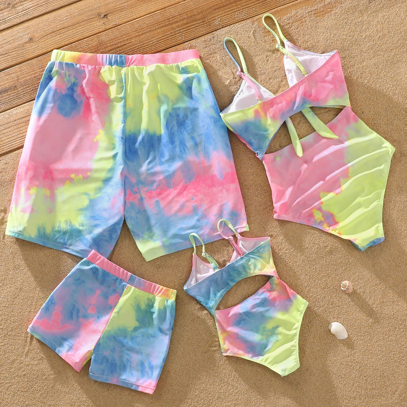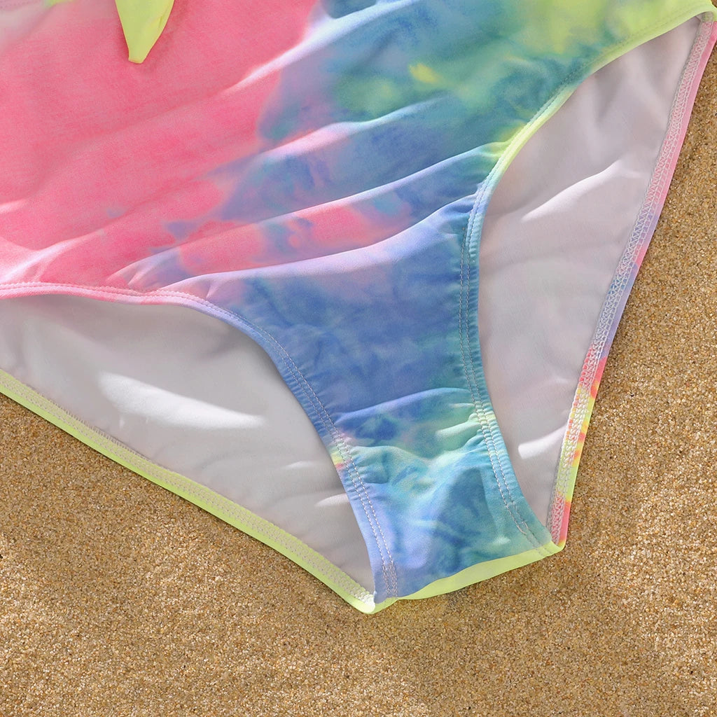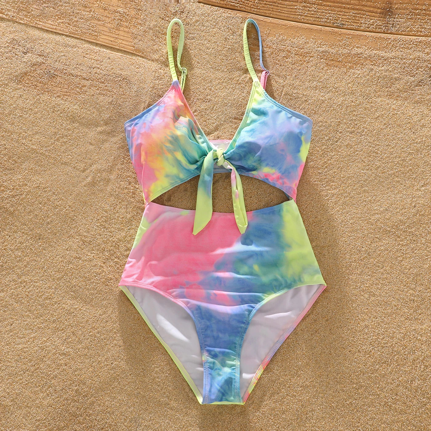 Trajes de baño a juego con cuello en V y teñido anudado: bañadores de una pieza y bañadores ahuecados