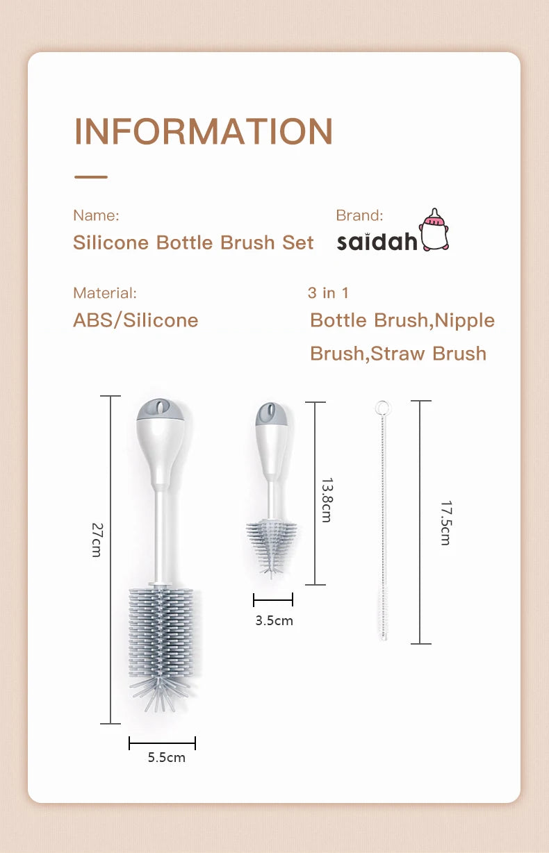 Presentamos nuestro innovador juego de limpieza de biberones 3 en 1, equipado con un cepillo con rotación de 360° para una limpieza integral y eficiente. Elaborado con silicona de alta calidad, este juego garantiza una limpieza profunda y deja impecables los biberones, tetinas y pajitas de tu bebé.