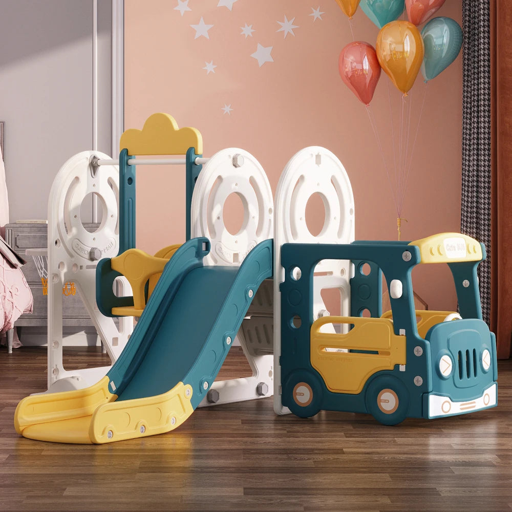 3-in-1 Kids Toddler Swing and Slide Set Climber Playset for Toddlers Age 3-6 – Bus-Shaped Multi-Activity Center with Basketball Hoop (Beige/Blue/Yellow)