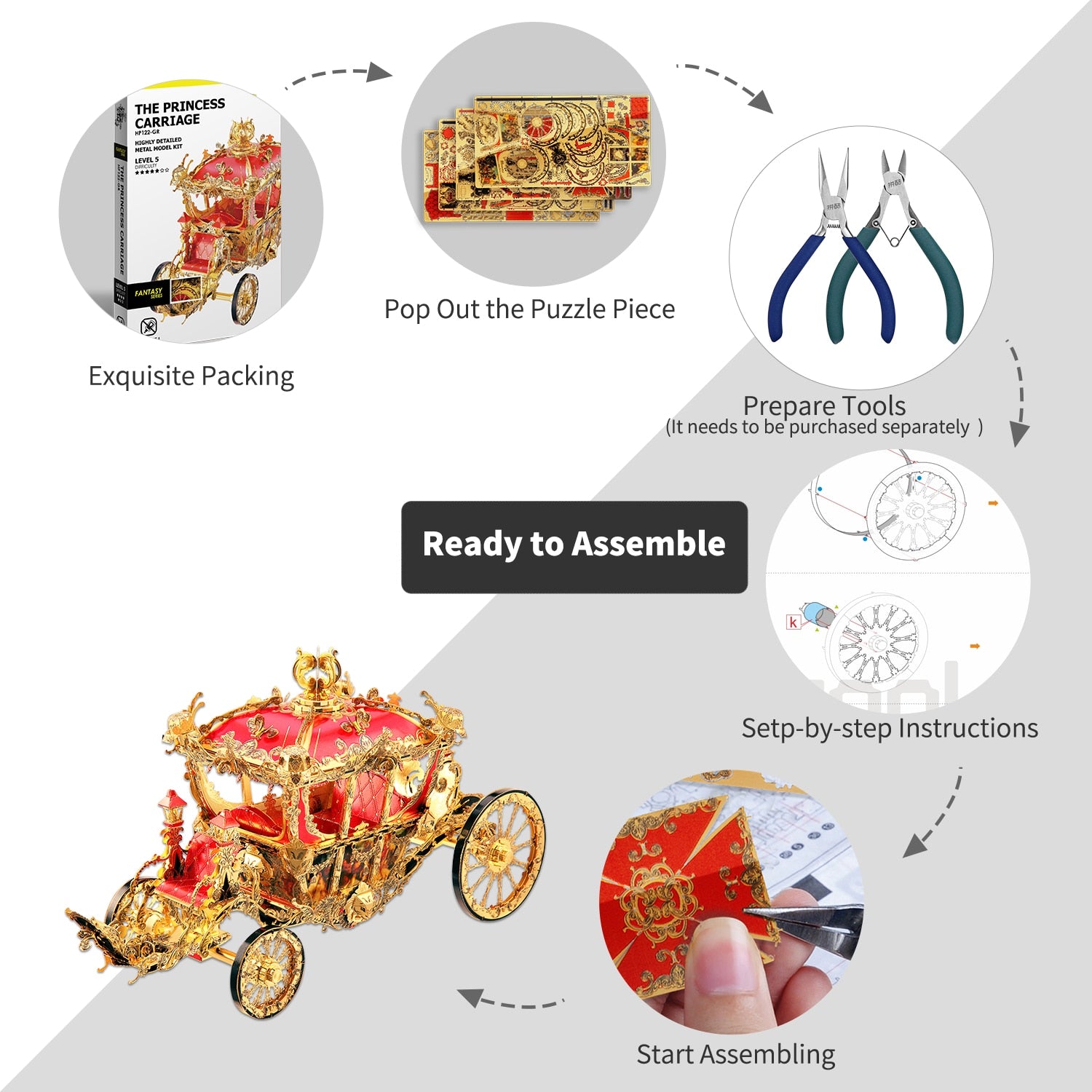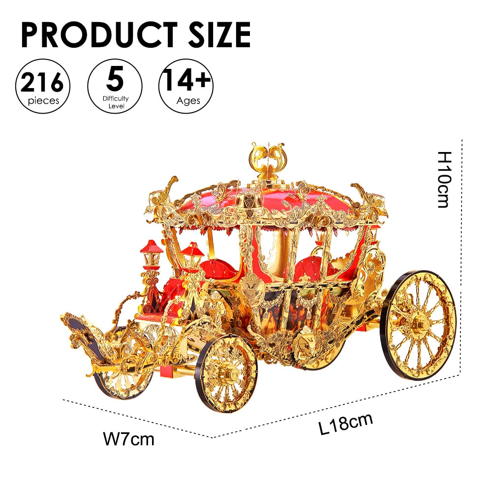 El modelo de metal Princess Carriage 3D Assemble simula el carruaje de la princesa en los cuentos de hadas. Diviértete montando este divertido modelo.