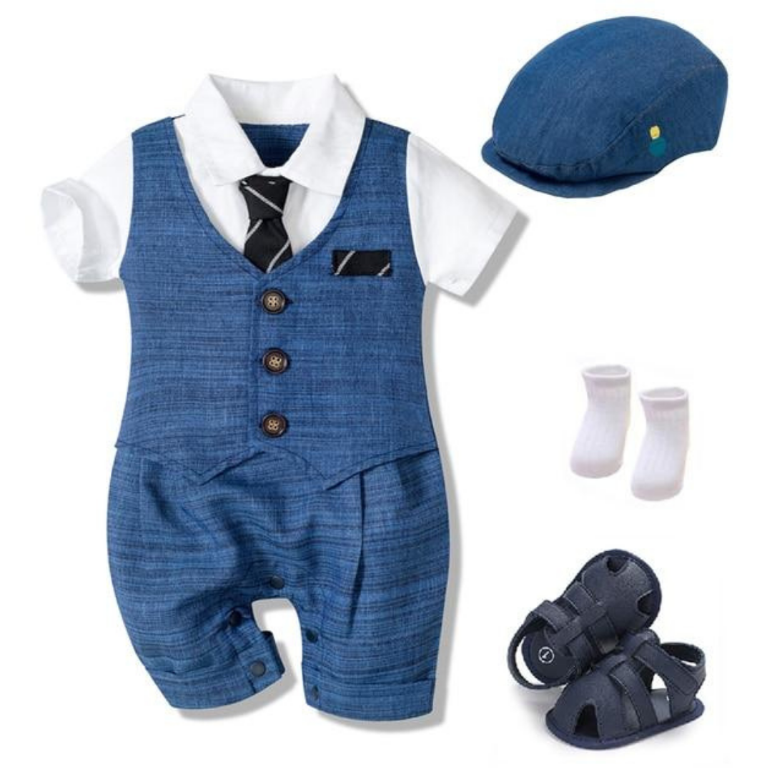 - 4 Pcs Set: romper, hat, shoes, and socks.