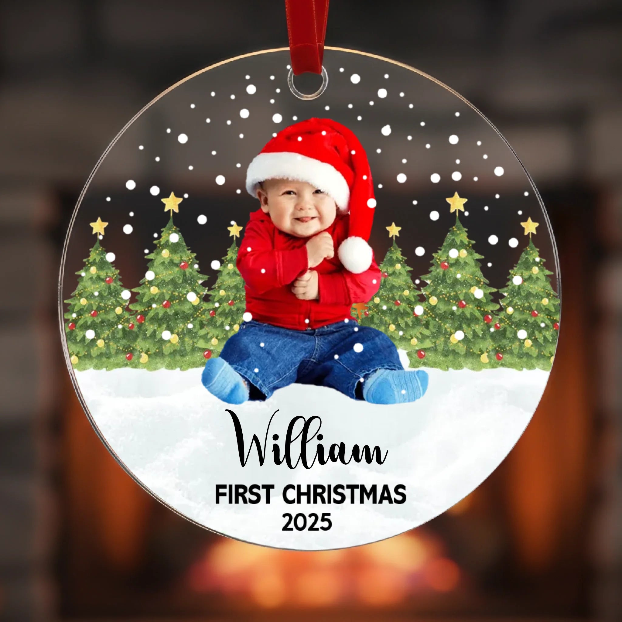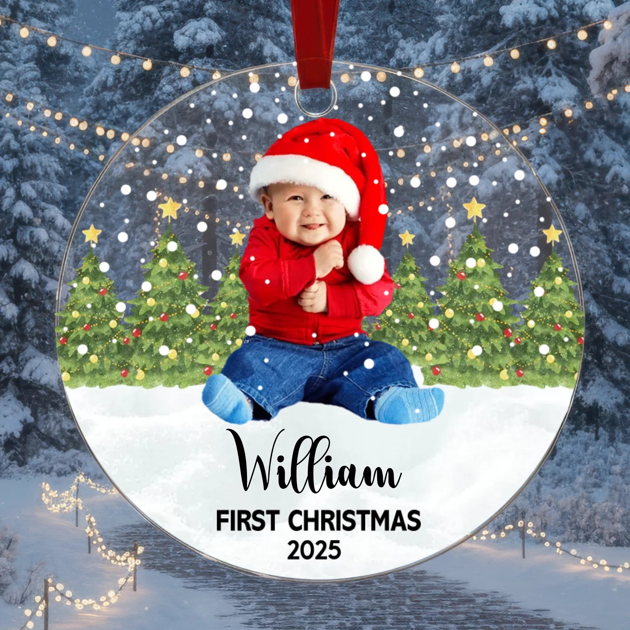 Celebra la primera Navidad de tu bebé con un hermoso adorno de acrílico personalizado que incluye la foto de tu bebé, su nombre y el color de texto personalizado. Este adorable recuerdo captura el momento mágico de la primera temporada navideña de tu hijo y lo convierte en una memoria preciada que podrás exhibir año tras año. Perfecto para decorar tu árbol de Navidad, regalar a tus seres queridos o conservarlo como un recuerdo para toda la vida.