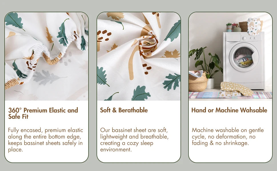 Nuestras sábanas para moisés están equipadas con una banda elástica que rodea el colchón, asegurando un ajuste seguro y evitando resbalones. Esto crea un espacio para dormir estable y cómodo para su bebé, brindándole tranquilidad.