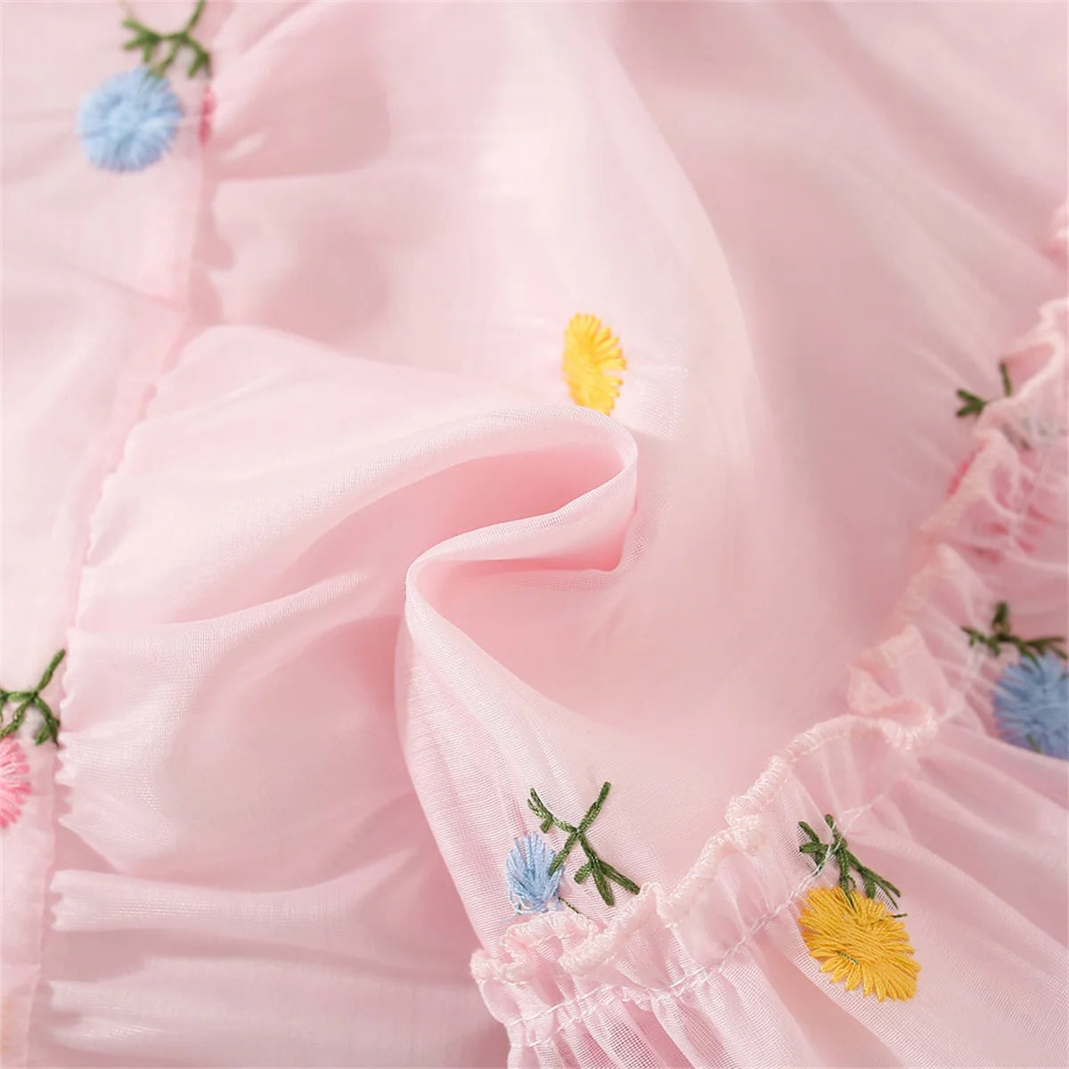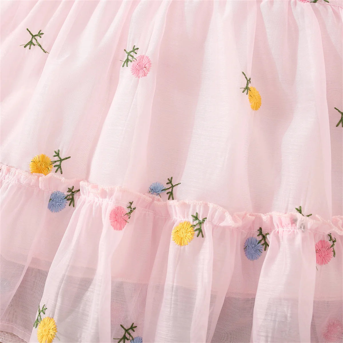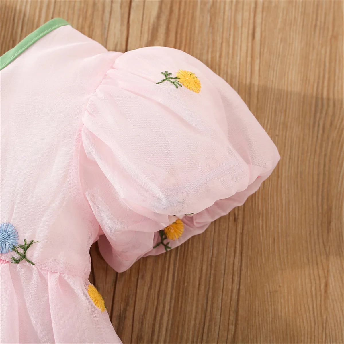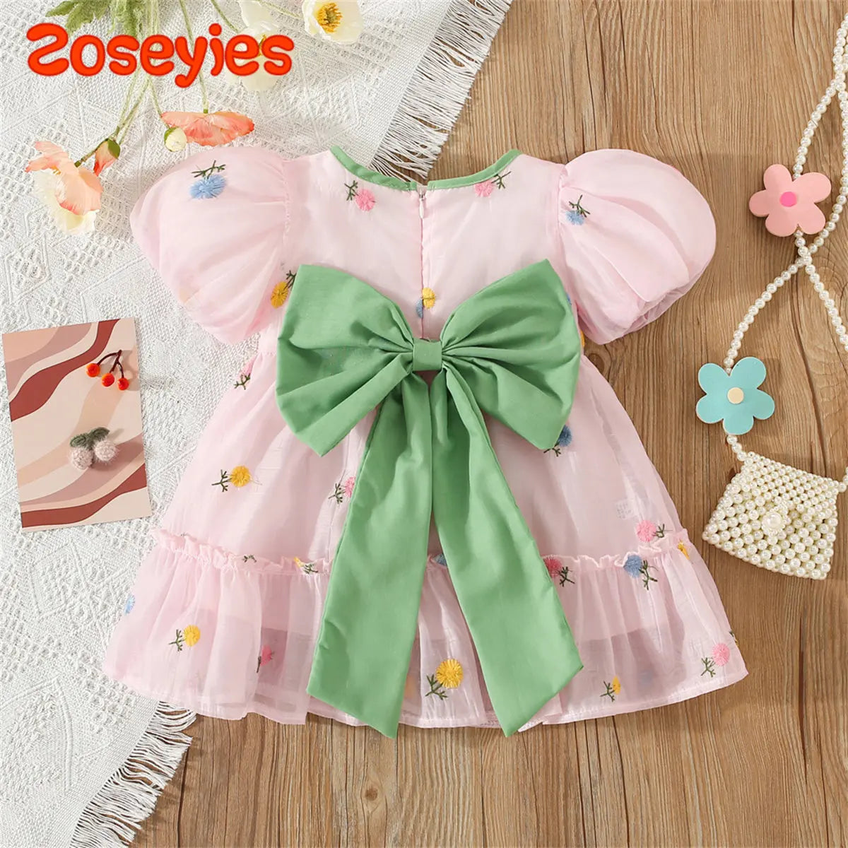 Vestido de verano para niñas de 0 a 3 años, bordado de flores, manga corta, cuello redondo liso, nuevo lazo trasero