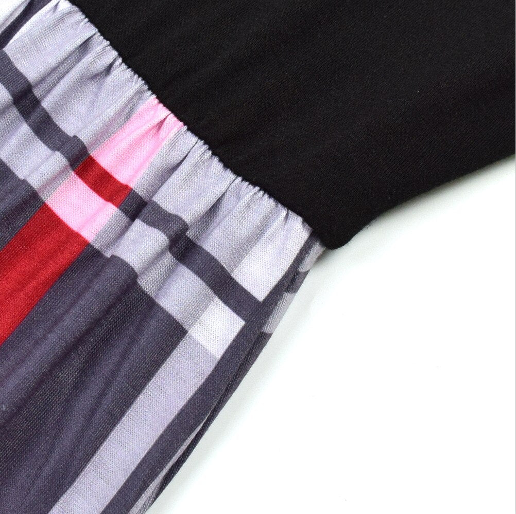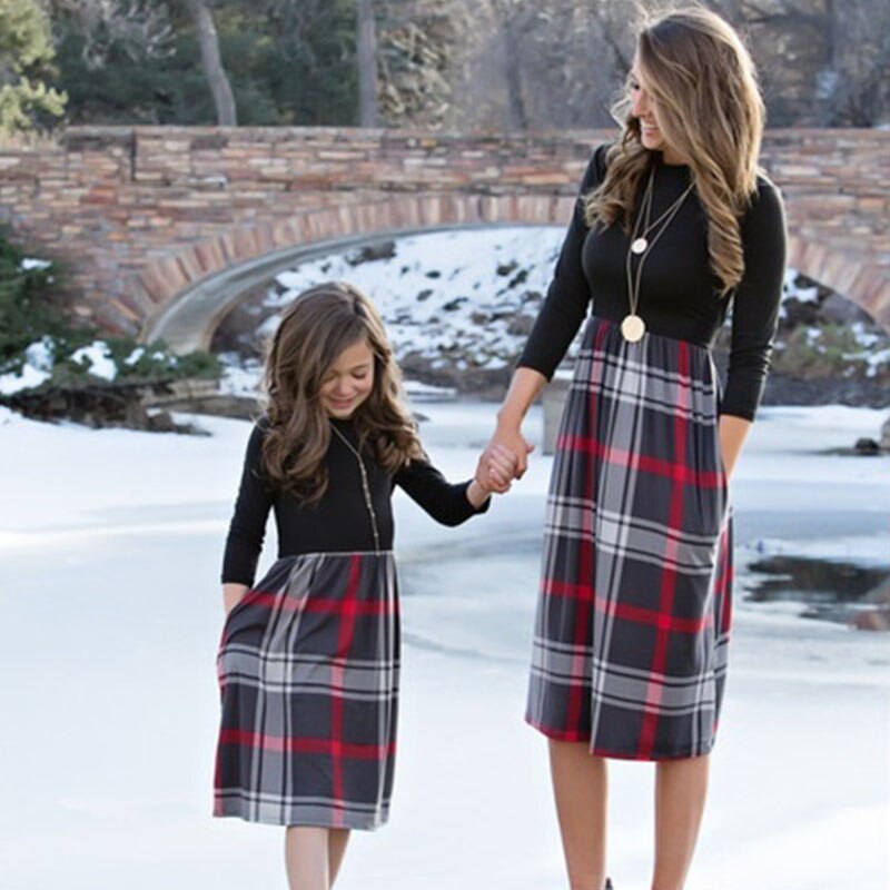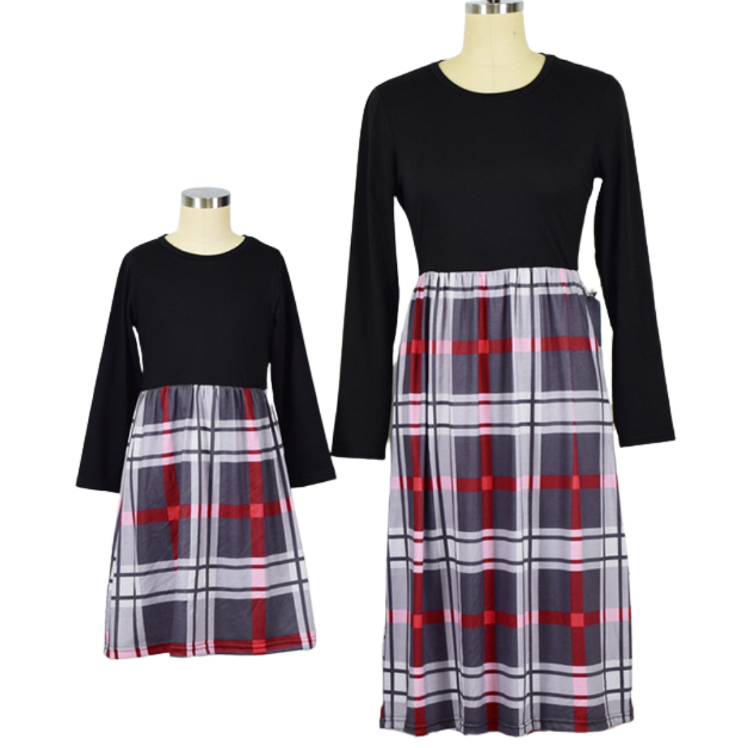 Vestido a juego de mamá y yo con parte superior negra y parte inferior a cuadros