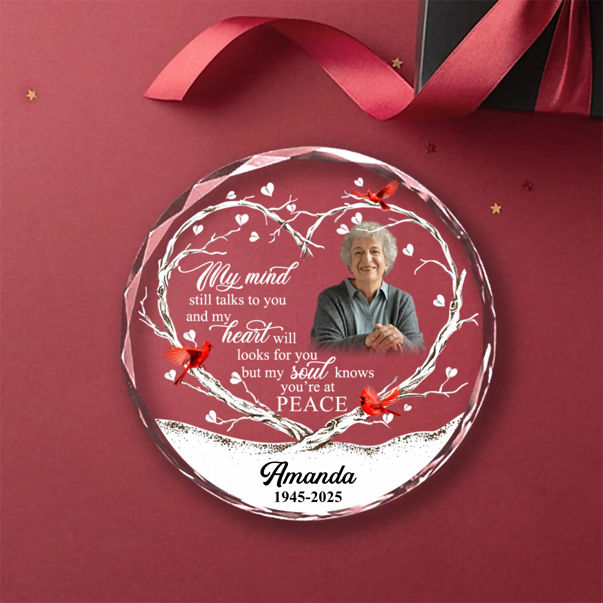 Custom Photo Memorial Round Glass Ornament - "My Mind Still Talks To You" Crystal Prism Keepsake with Name & Years