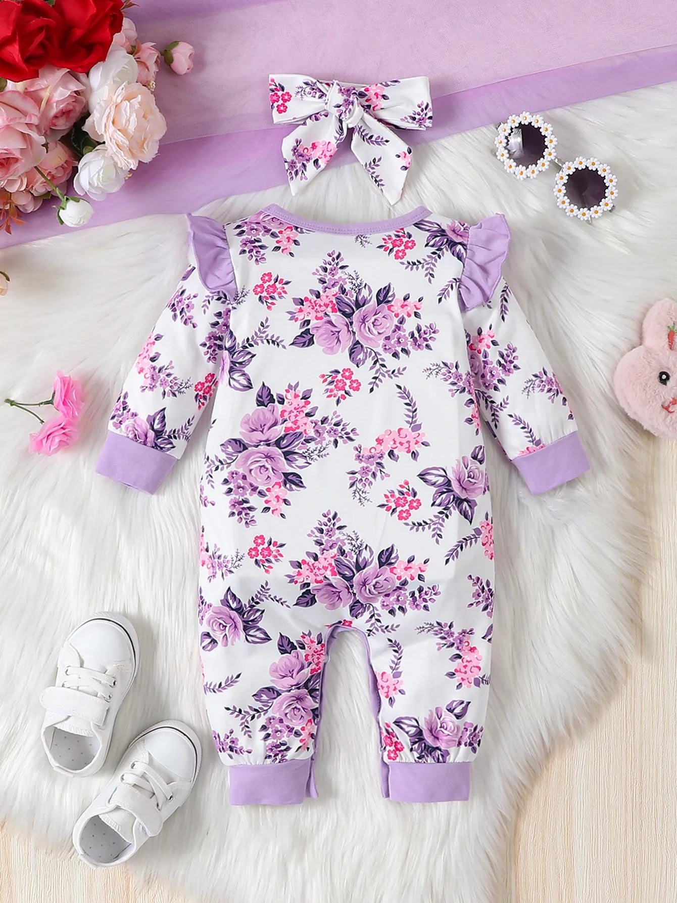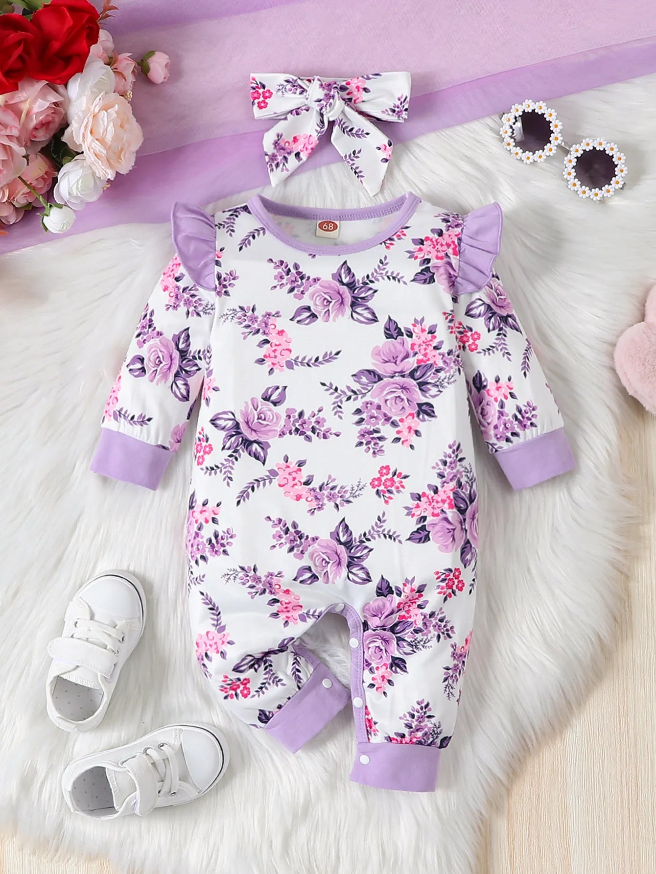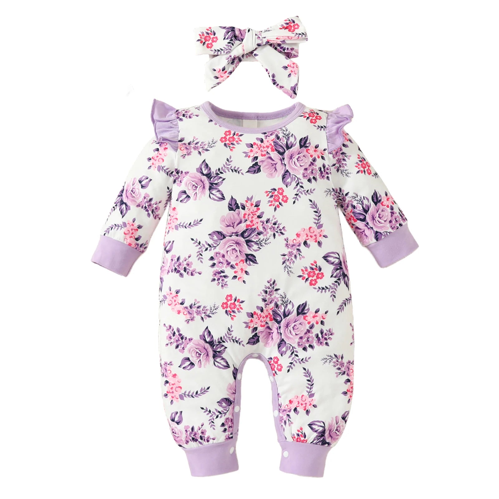 Conjunto de mamelucos con estampado floral para niñas recién nacidas con diadema con lazo