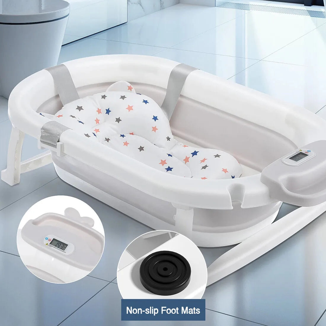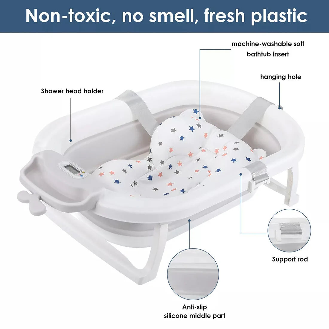 Extra-Large Foldable Baby Bathtub (44L) with Digital Temperature Sensor, Non-Toxic Material, and Machine-Washable Bath Cushion for Newborns to Toddlers