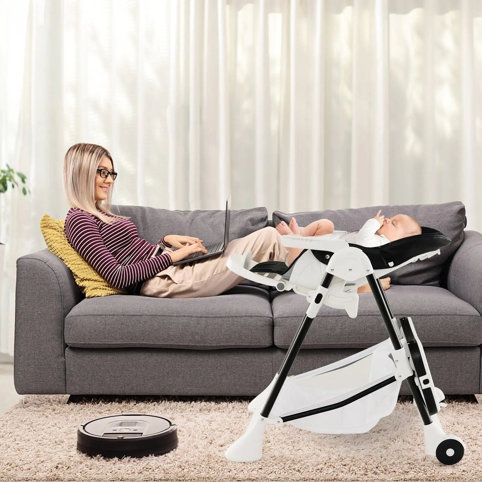 Folding Baby High Chair with 6-Level Height & 5-Position Recline, Detachable Double Tray (Dishwasher Safe), and Rolling Wheels for Easy Storage (6–36 Months)