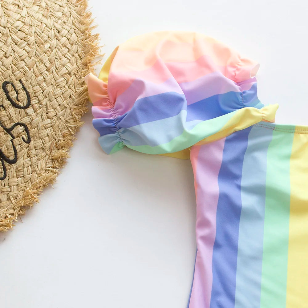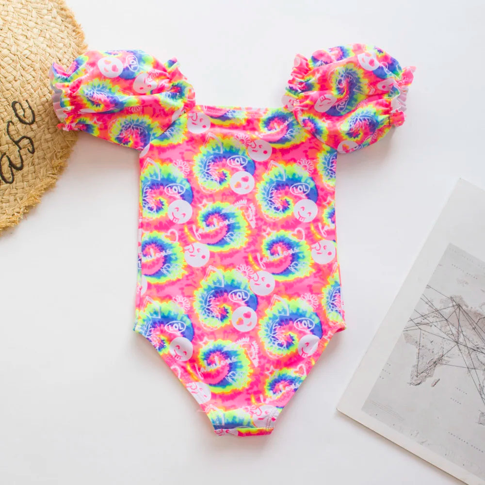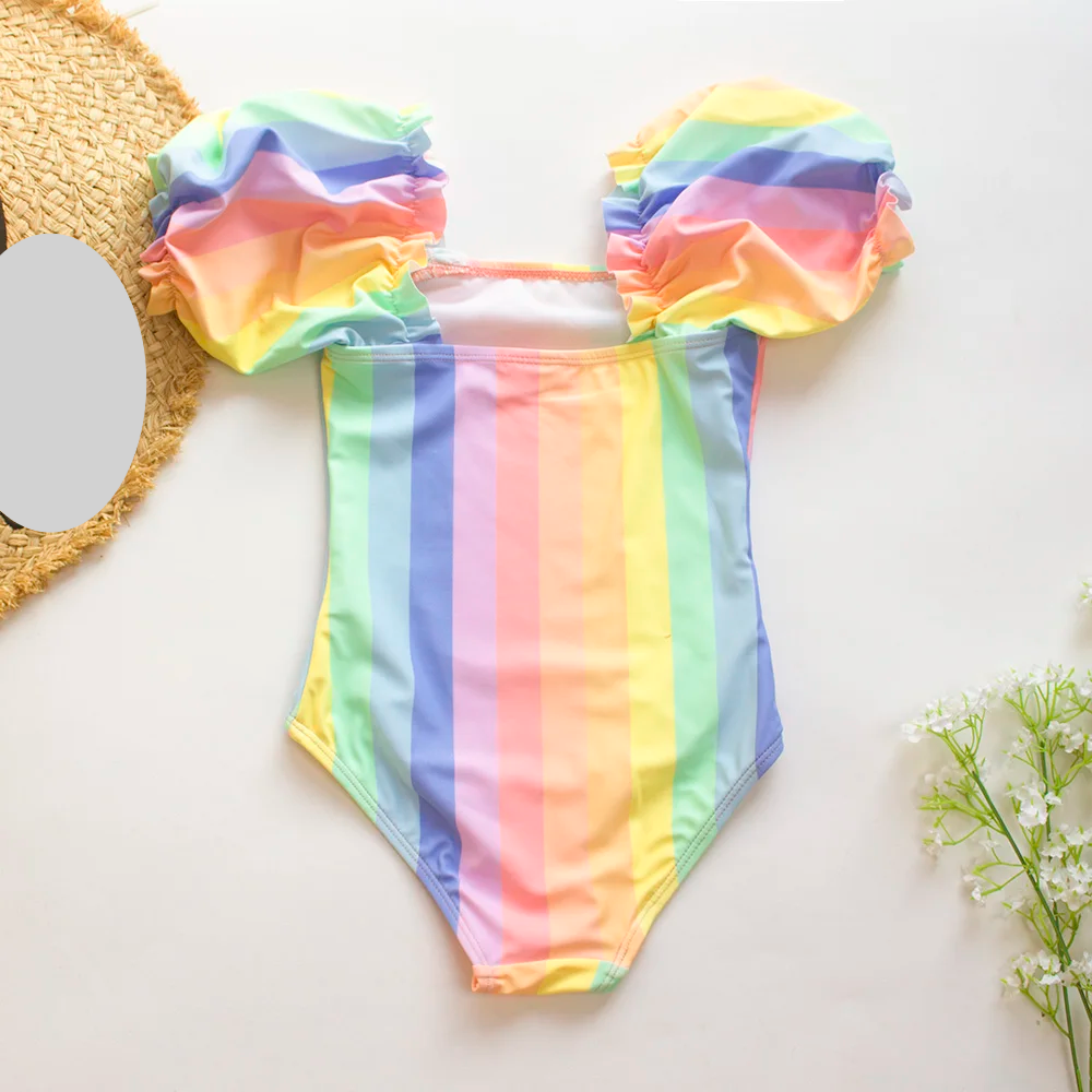 Ya sea que su hija esté chapoteando en la piscina, construyendo castillos de arena en la playa o simplemente tomando el sol, nuestro traje de baño para niña con mangas abullonadas degradadas es la elección perfecta para todas sus aventuras acuáticas.