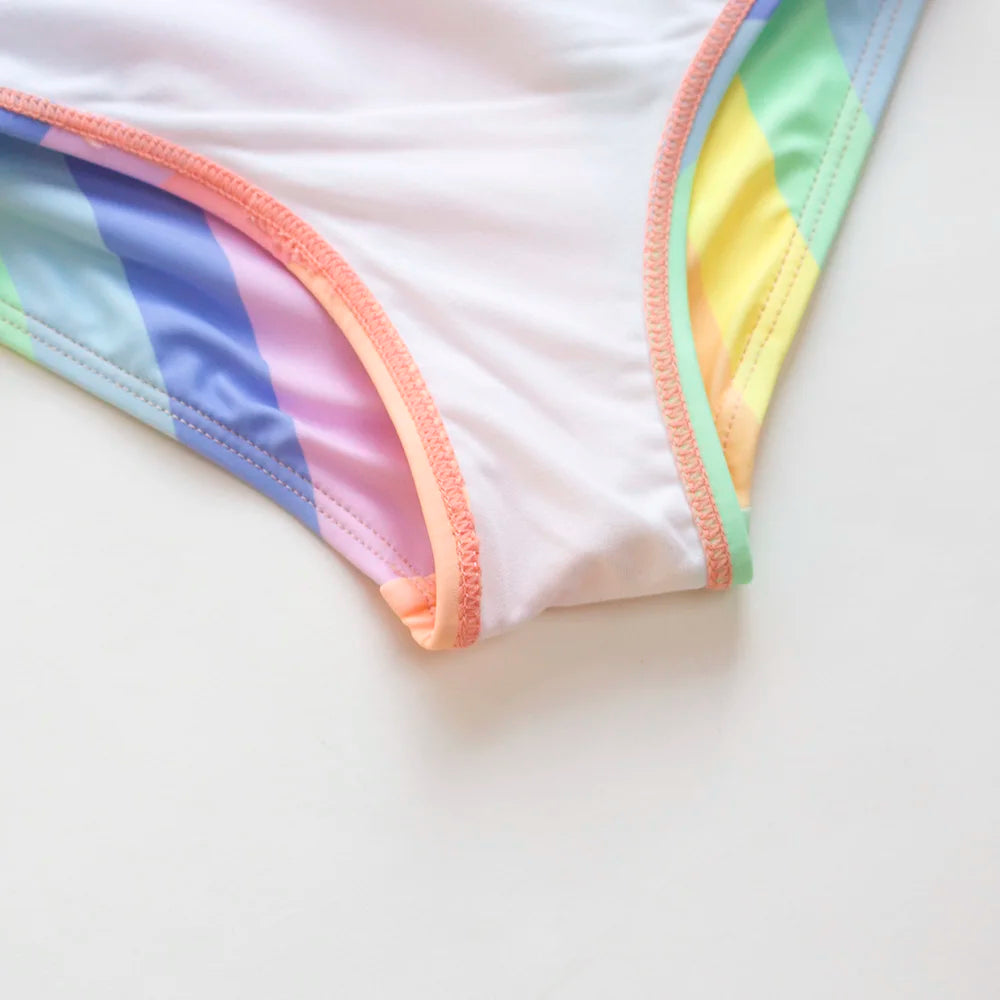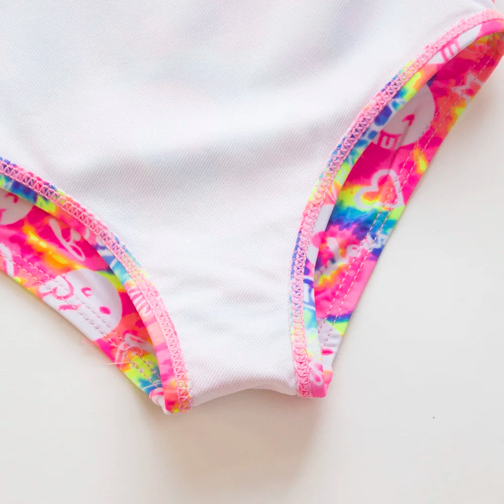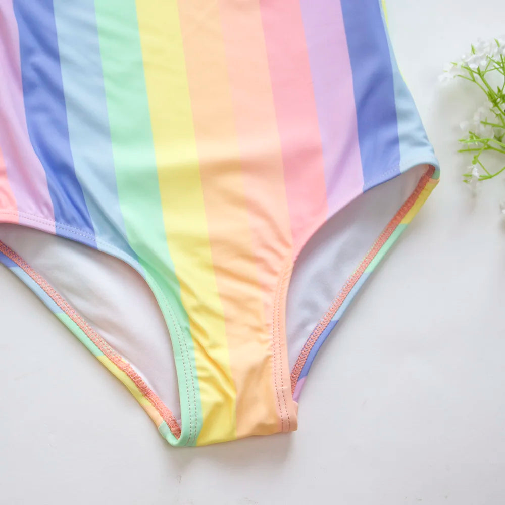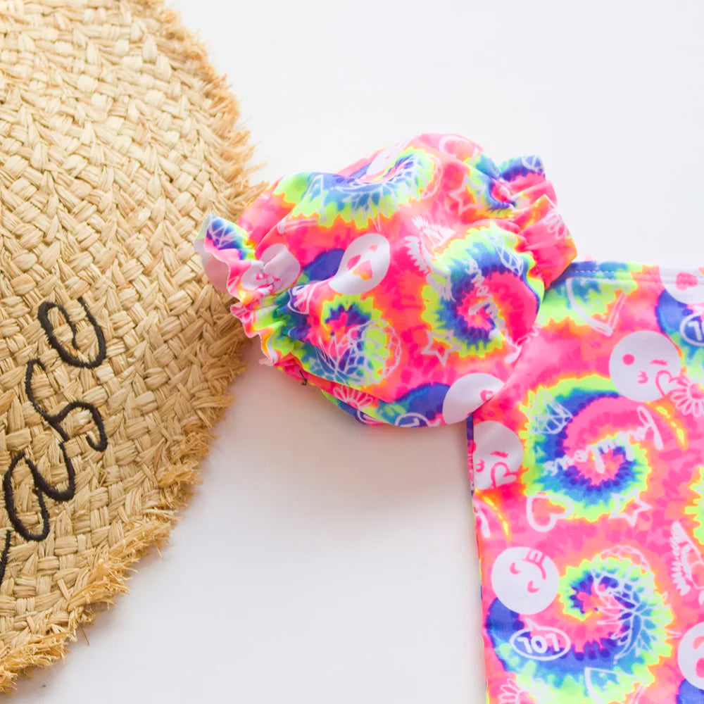 Ya sea que su hija esté chapoteando en la piscina, construyendo castillos de arena en la playa o simplemente tomando el sol, nuestro traje de baño para niña con mangas abullonadas degradadas es la elección perfecta para todas sus aventuras acuáticas.
