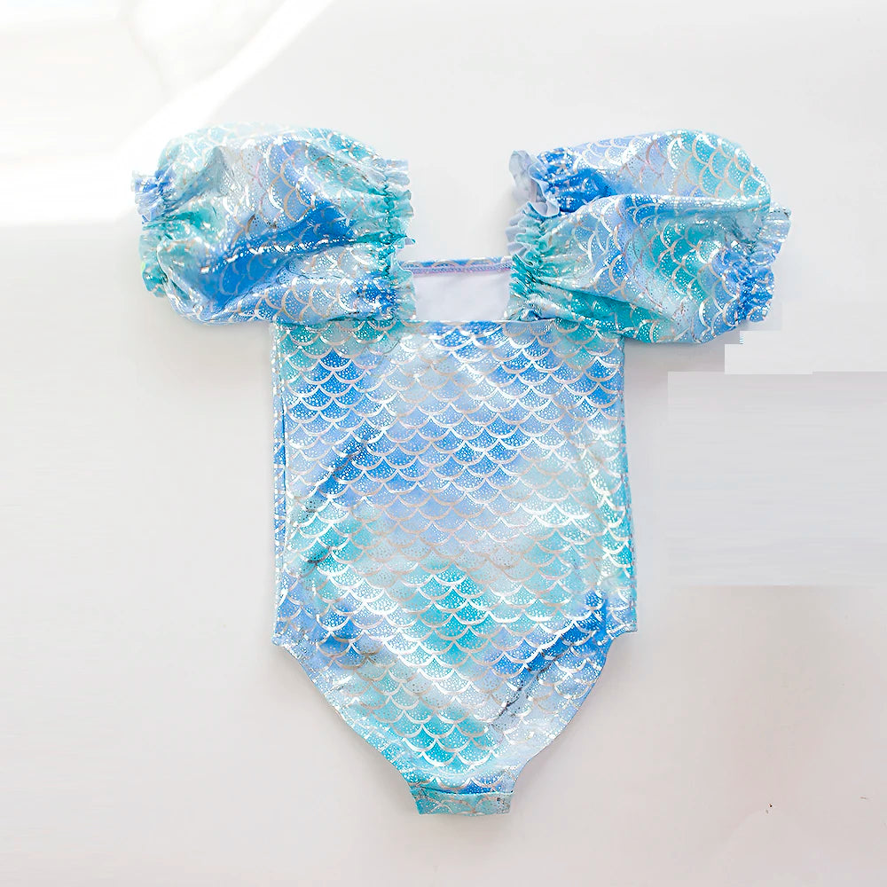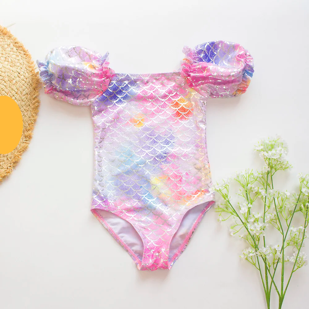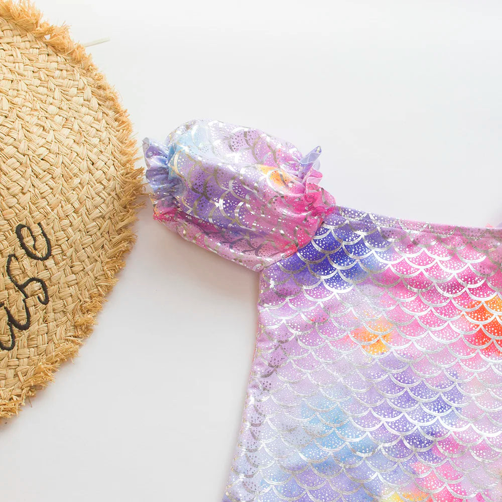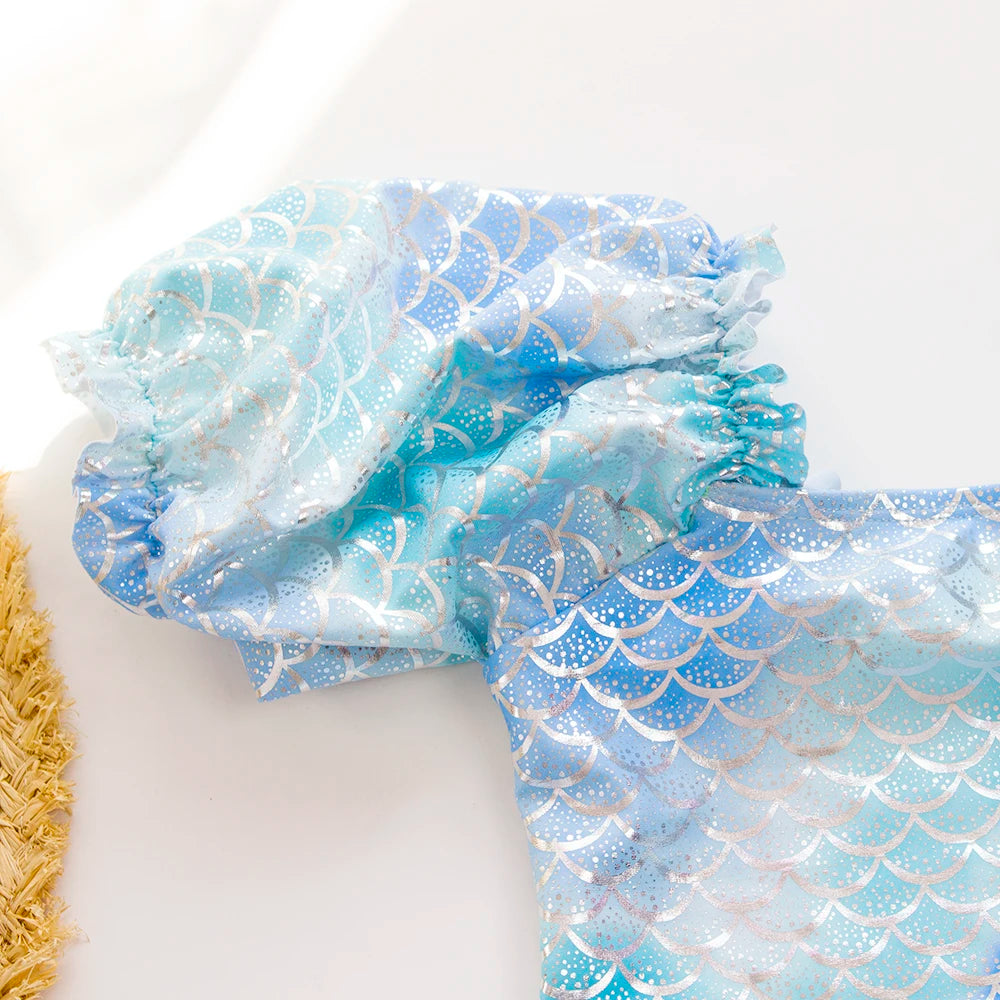 Presentamos nuestro impresionante traje de baño para niñas con mangas abullonadas y degradados: ¡traje de baño de sirena!