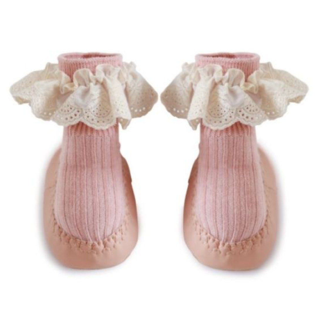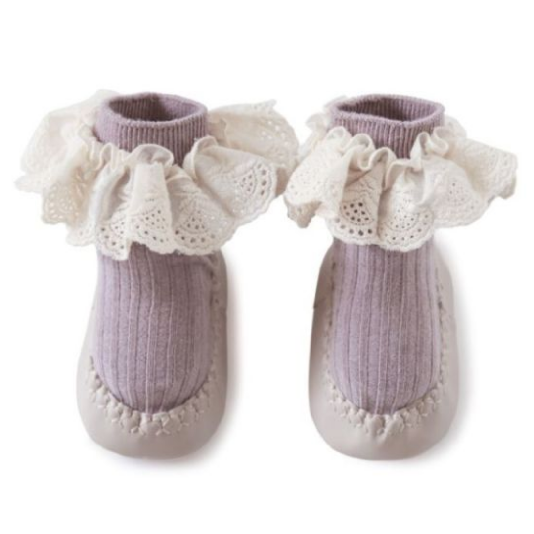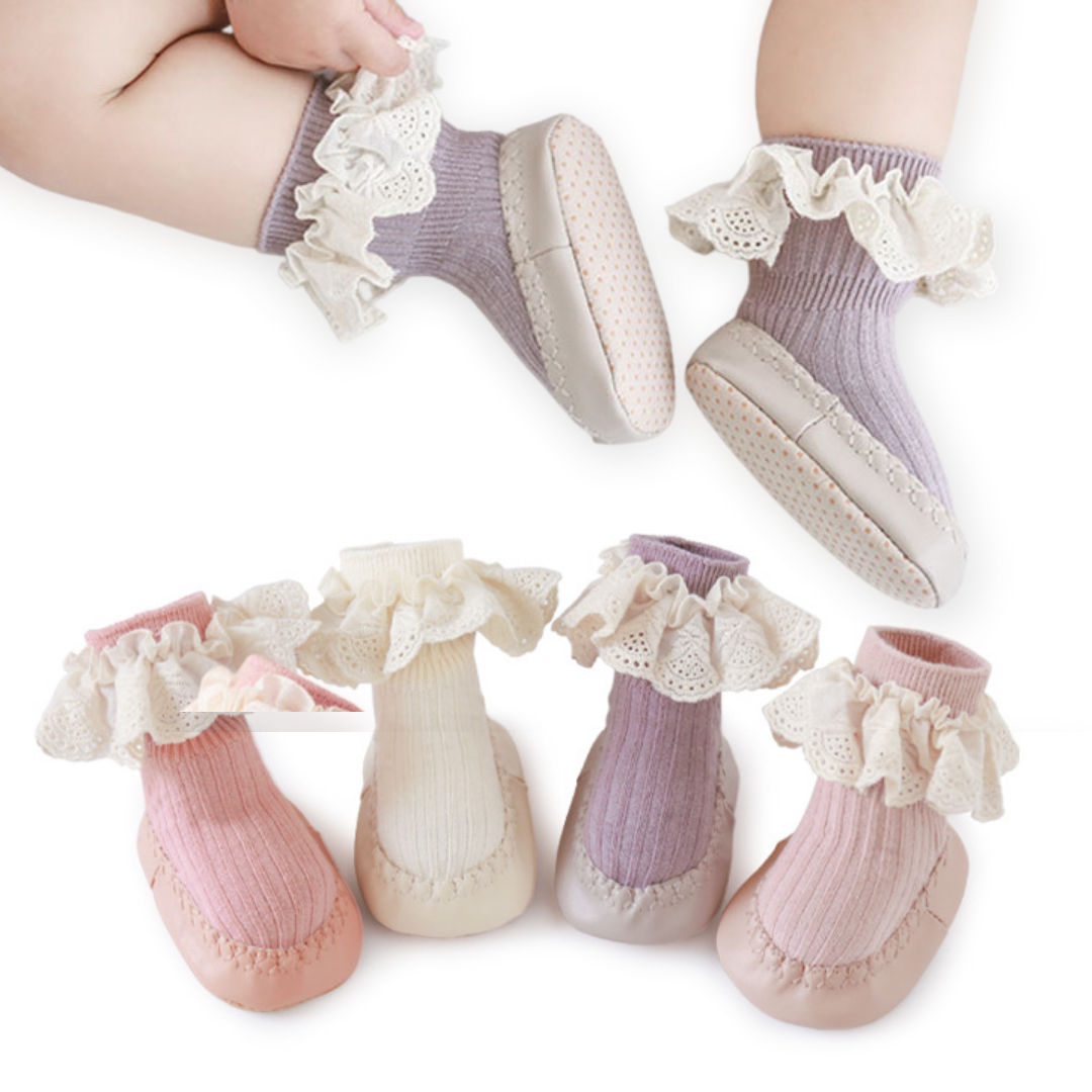 Estos calcetines de algodón suave con diseño de encaje, zapatos antideslizantes para andador de bebé, calcetines de alta calidad para bebés. Estos calcetines están diseñados con las máquinas de tejer más avanzadas y son muy suaves y cómodos.