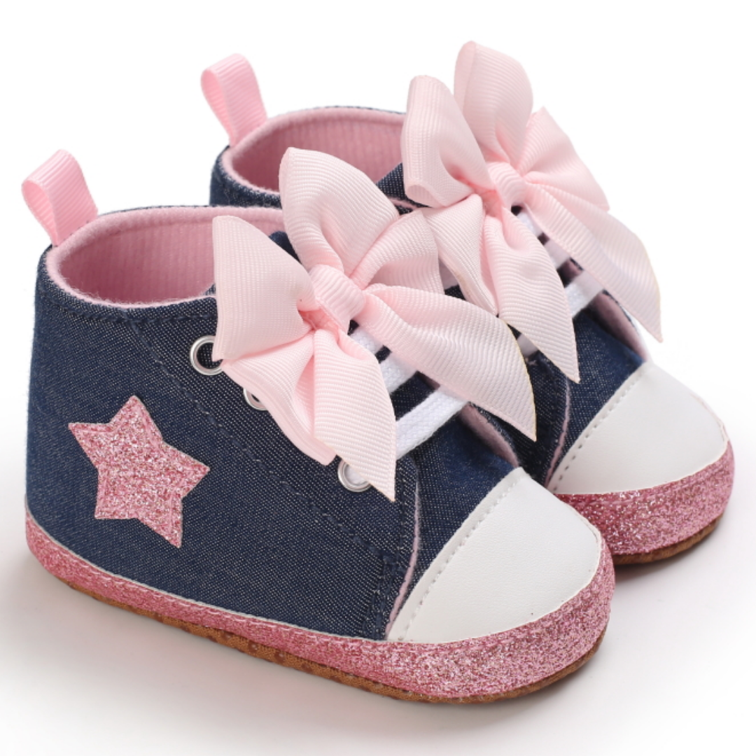 Estas zapatillas de deporte Lovely Bow Hi-cut para bebé niña First Walker están hechas de lona de alta calidad y material de suela suave antideslizante. Son cómodos y antideslizantes para que los niños los utilicen libremente. El bebé estará cómodo con estos lindos zapatos de bebé sin preocuparse por resbalar.