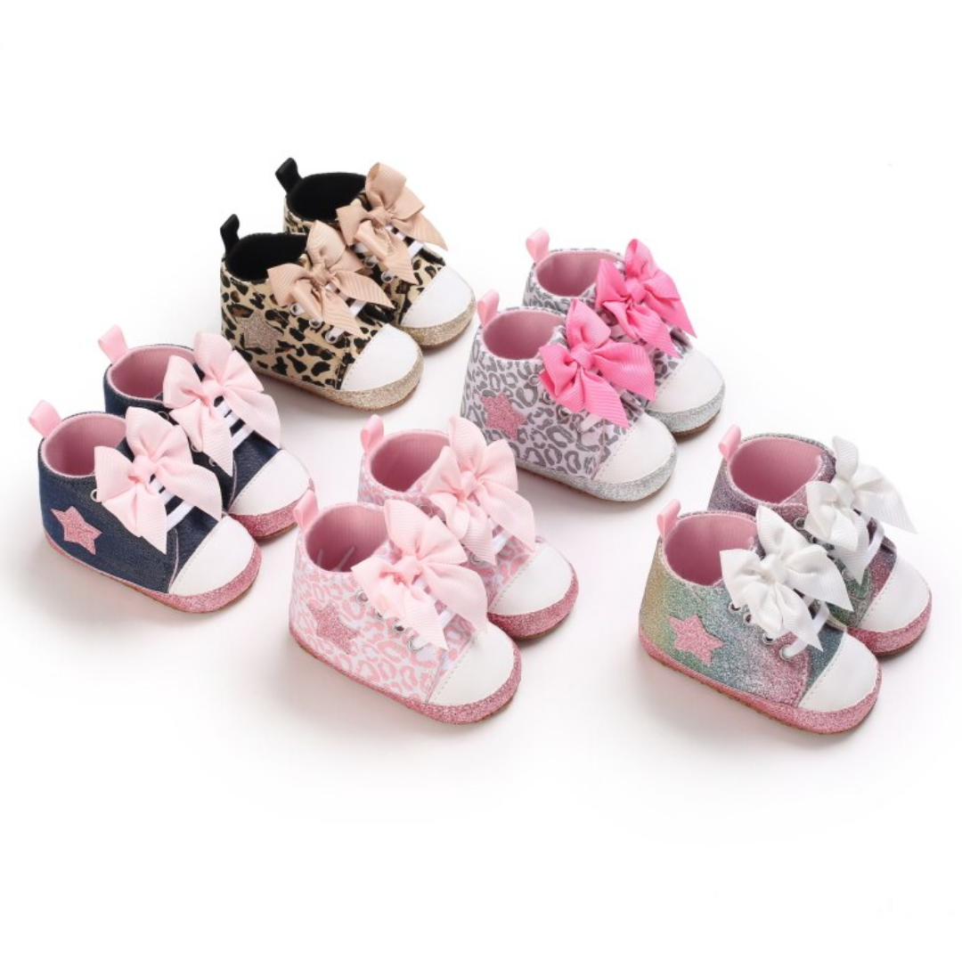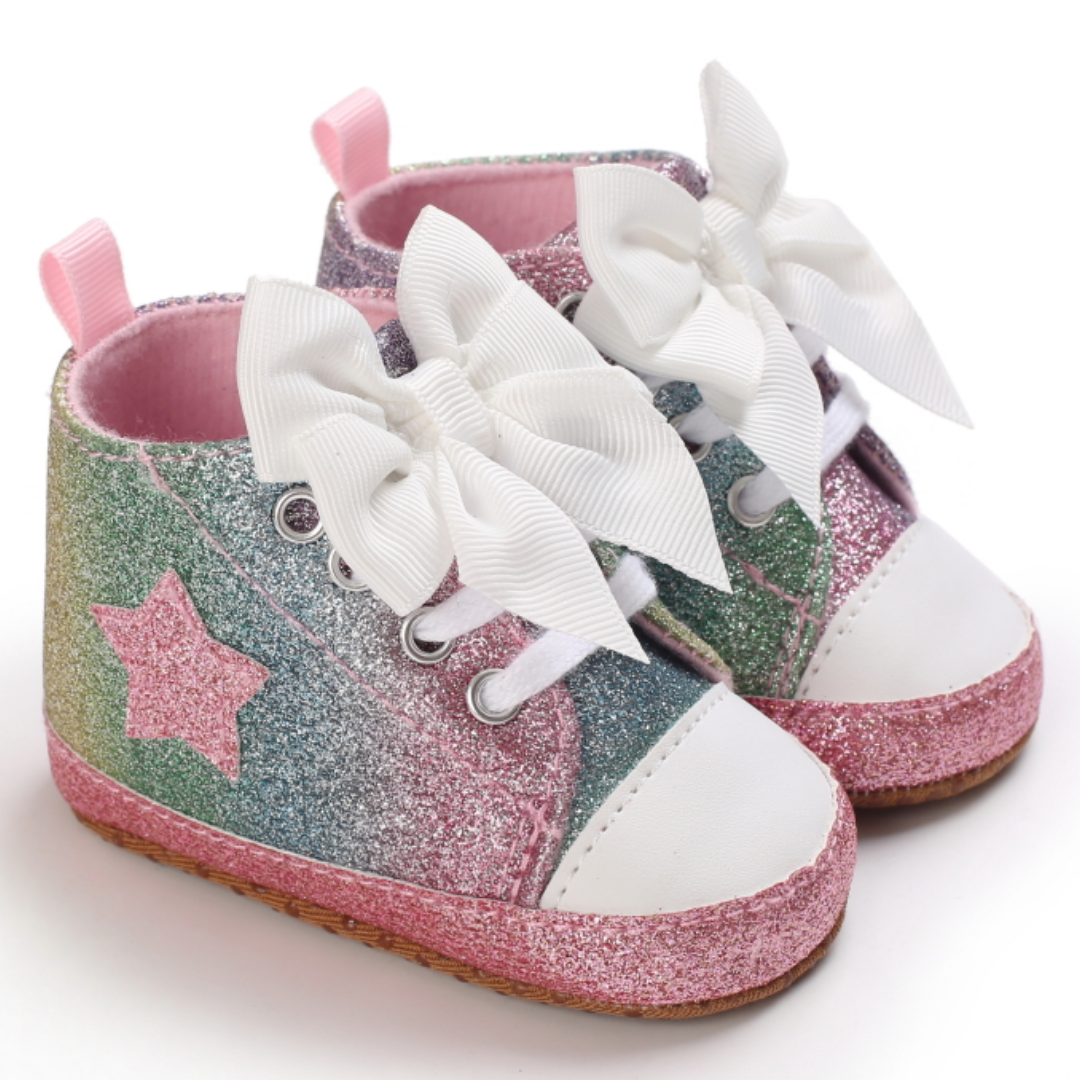 Preciosos zapatos de zapatilla de deporte de primer caminante para niña de corte alto con lazo