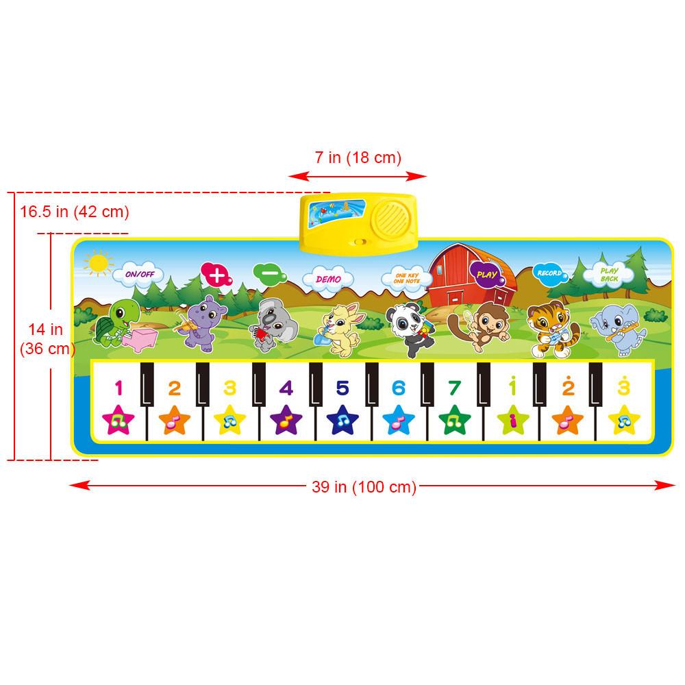 El tapete musical incluye 10 teclas de piano, 8 tonos de estilo musical (piano, violín, acordeón, trompeta, vibráfono, oboe, guitarra, flauta), 9 canciones de demostración y función de grabación y reproducción. Estimular el desarrollo auditivo de los niños.
