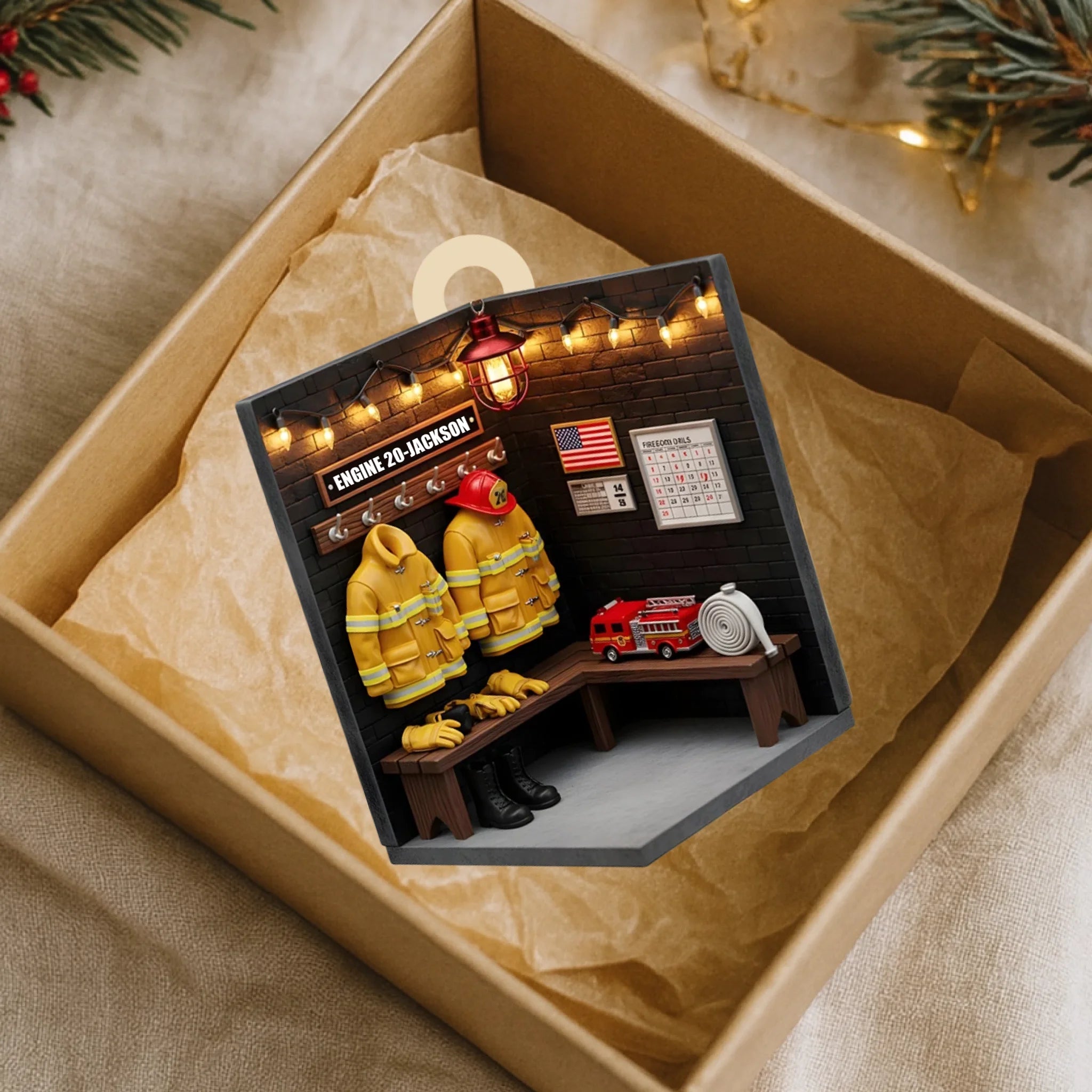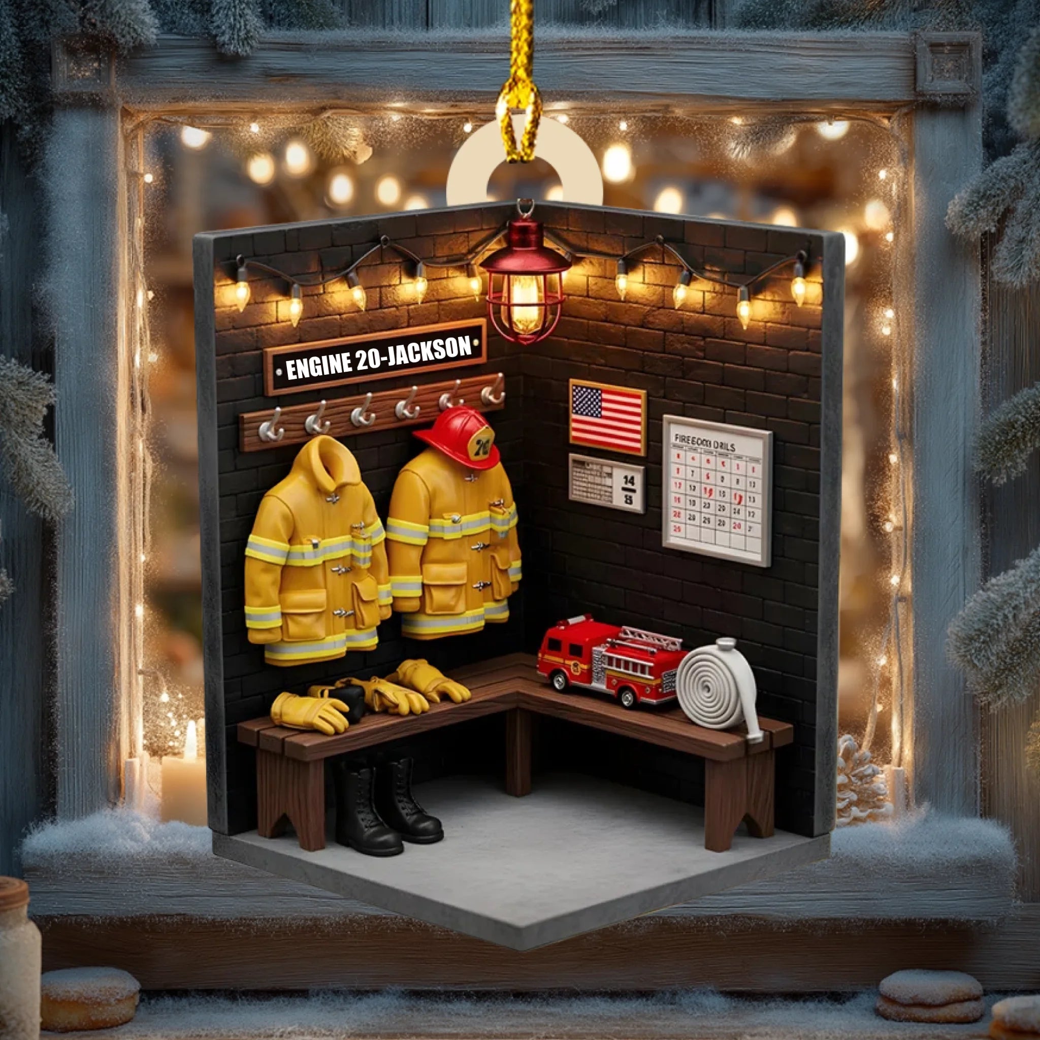 Featuring a cozy firehouse locker scene complete with jackets, boots, helmets, and an American flag, this ornament can be customized with your firefighter’s name, station number, and jacket color — making it a truly meaningful decoration for Christmas or year-round display.