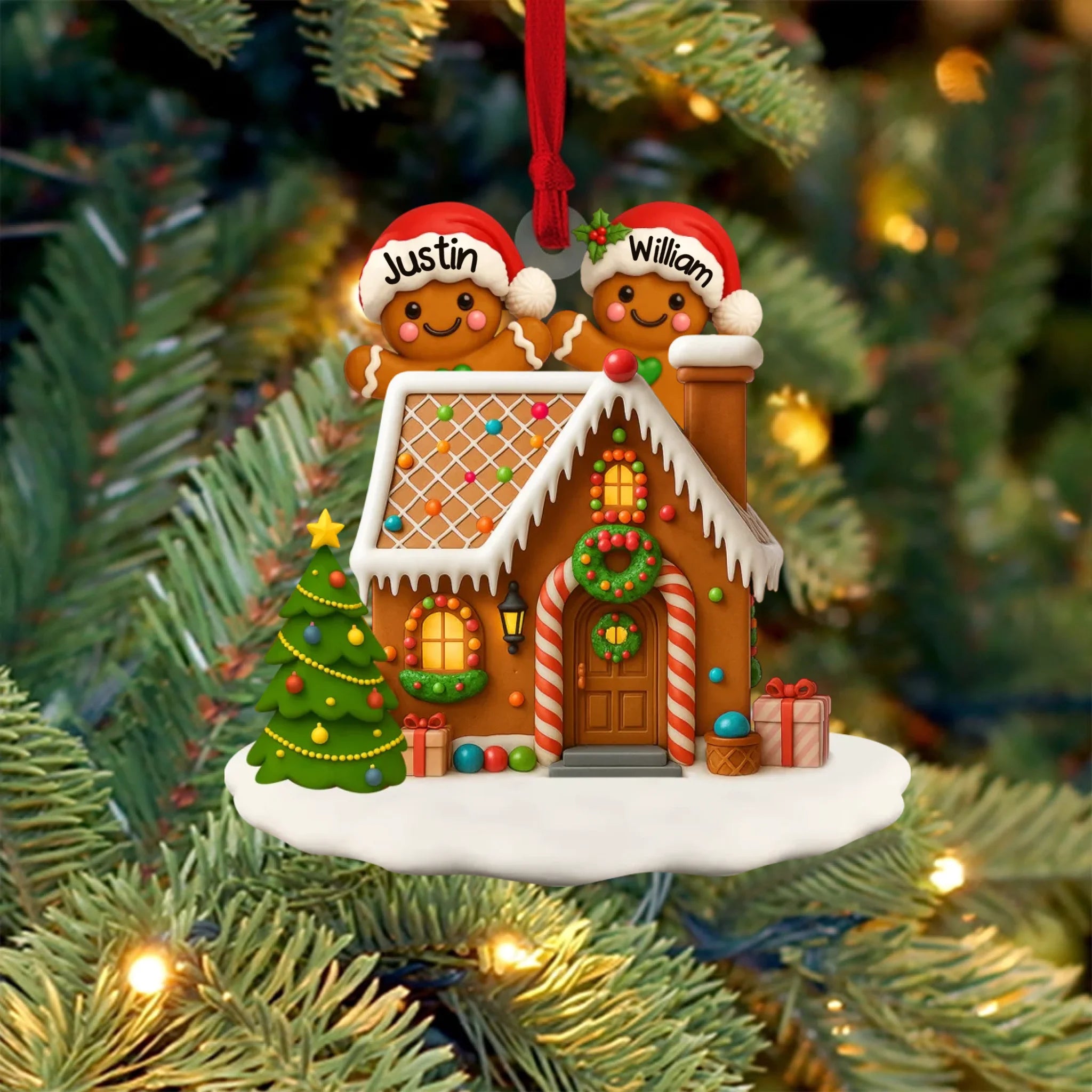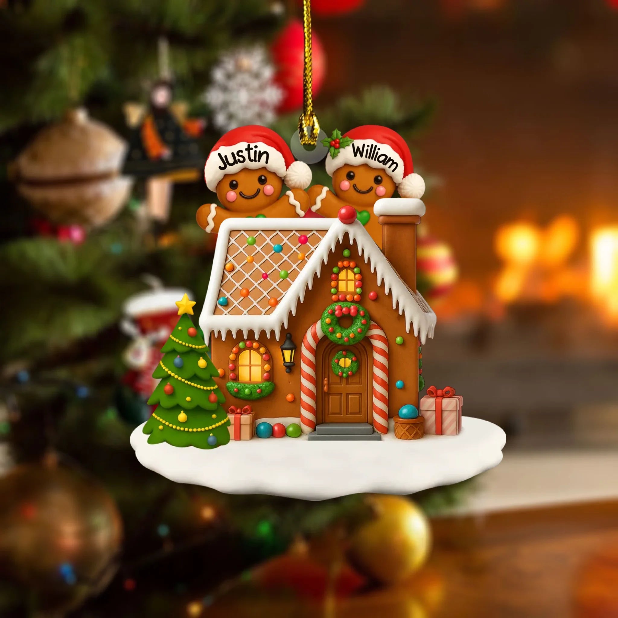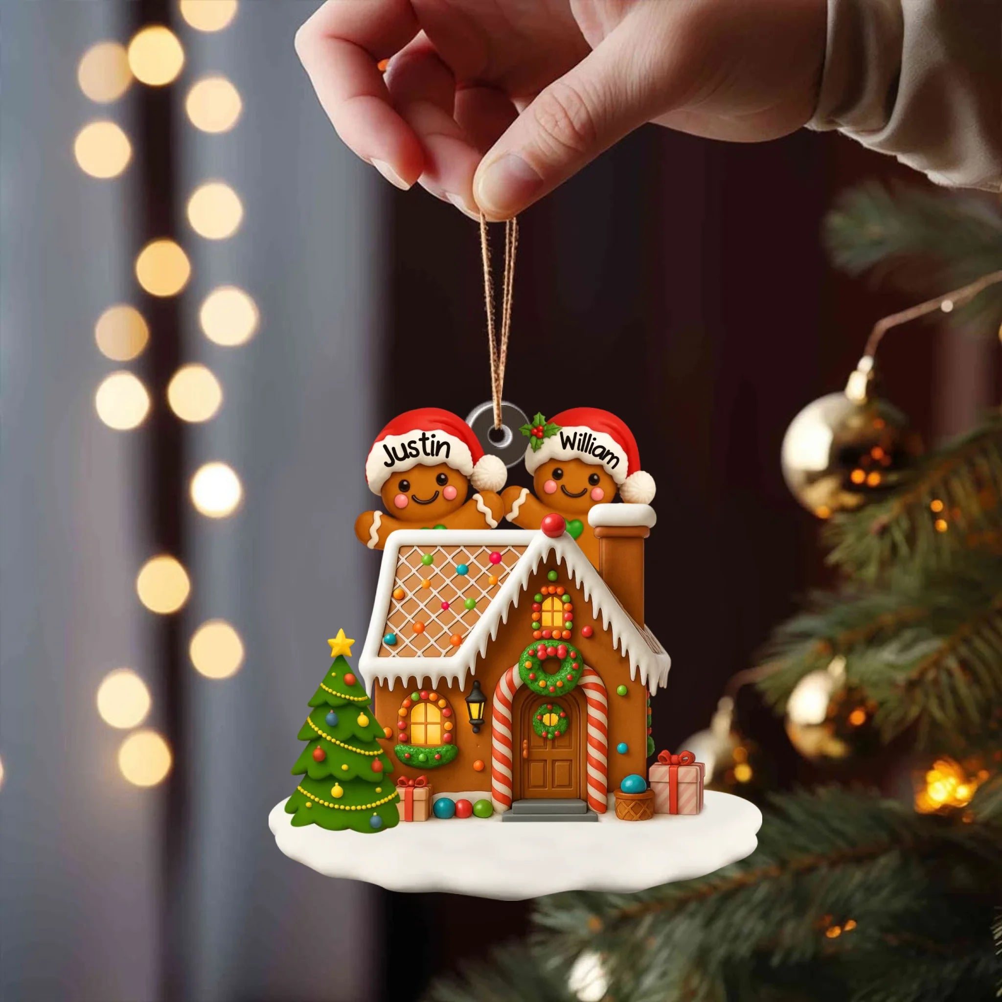 Decorative Christmas ornament with gingerbread house and personalized names on a festive background.