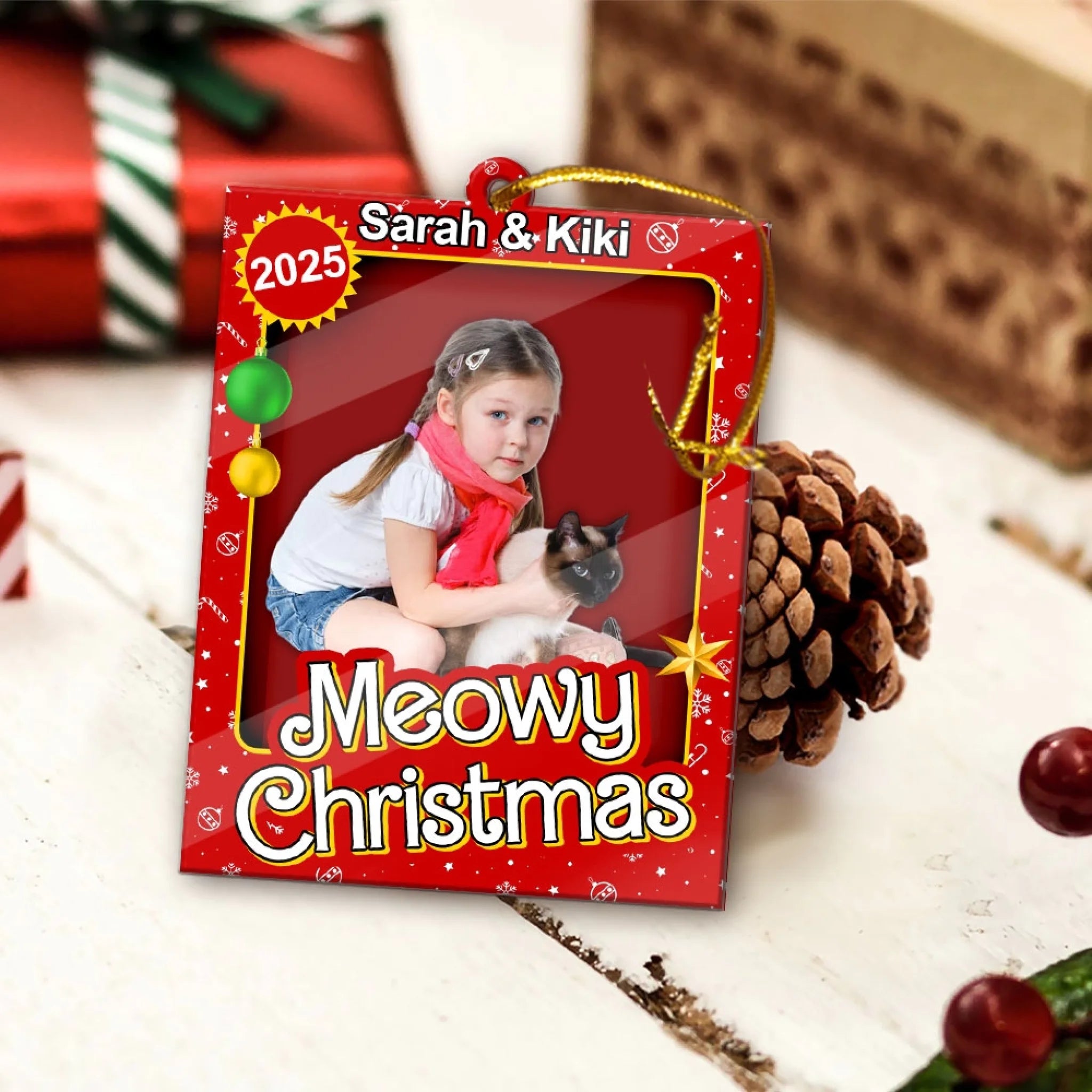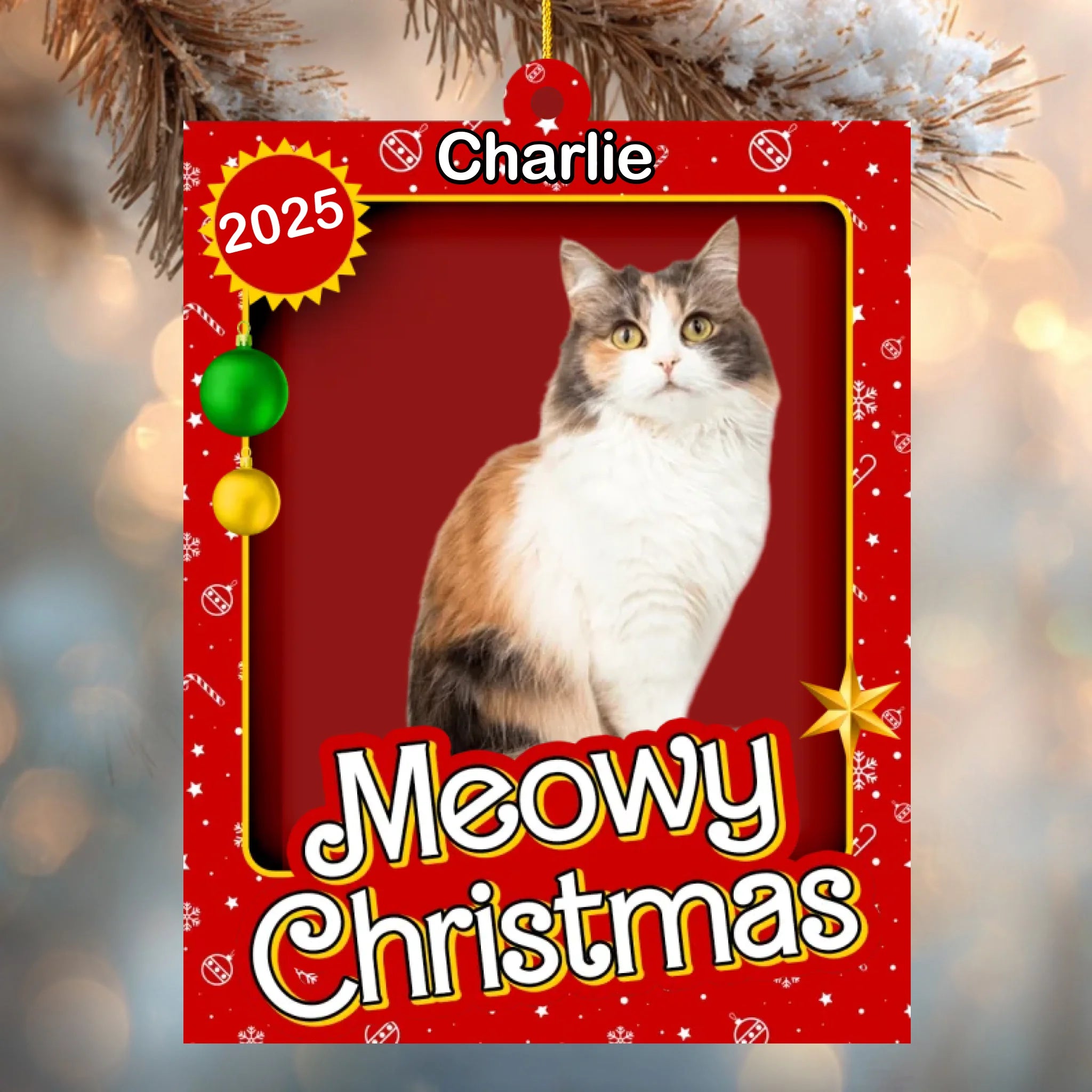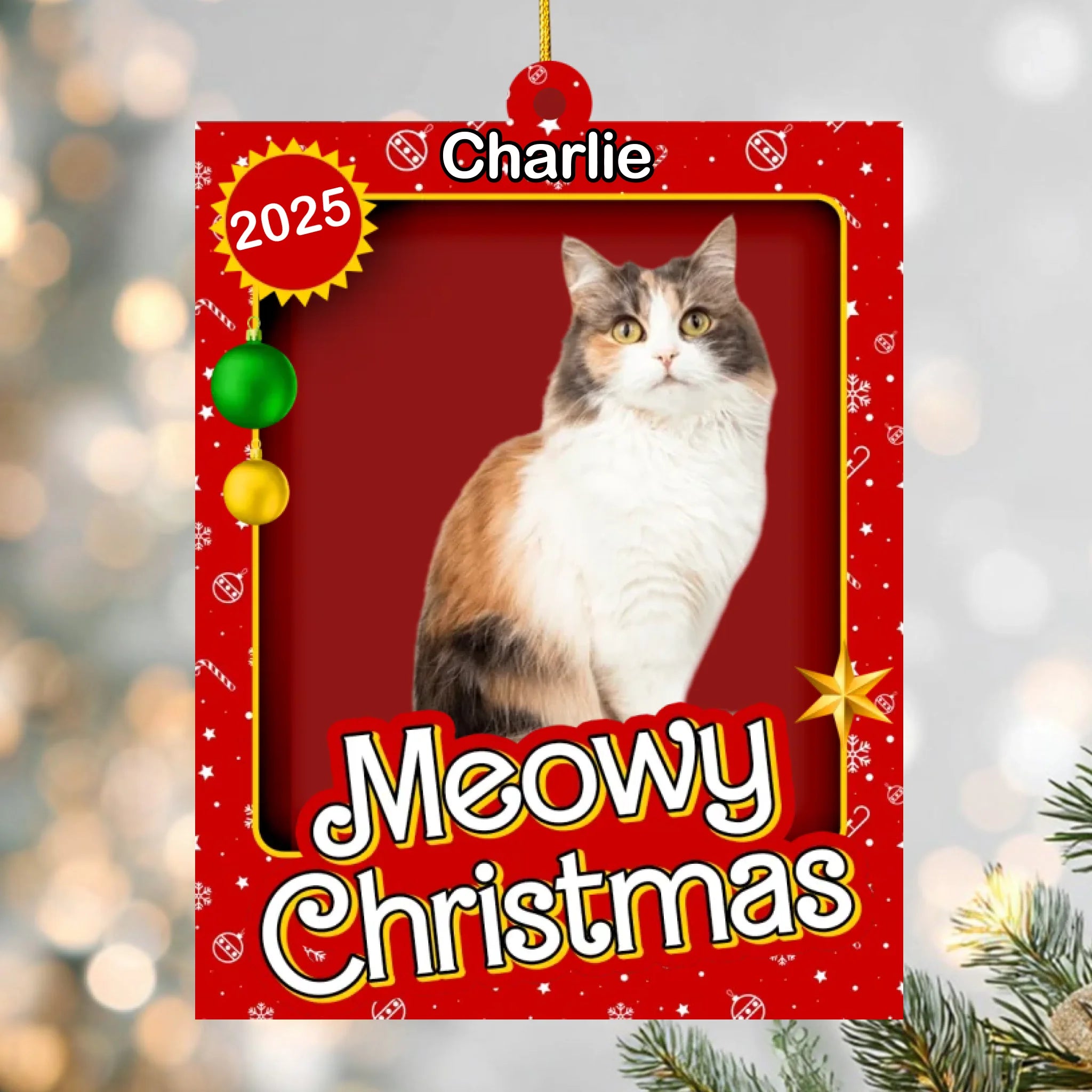 El brillante fondo rojo, los detalles dorados y el adorable diseño de “Meowy Christmas” lo convierten en una forma encantadora de mostrar la personalidad de tu amigo peludo. Ya sea que estés decorando tu propio árbol o regalándolo a otro dueño de gato, este adorno seguramente traerá sonrisas y alegría durante toda la temporada.