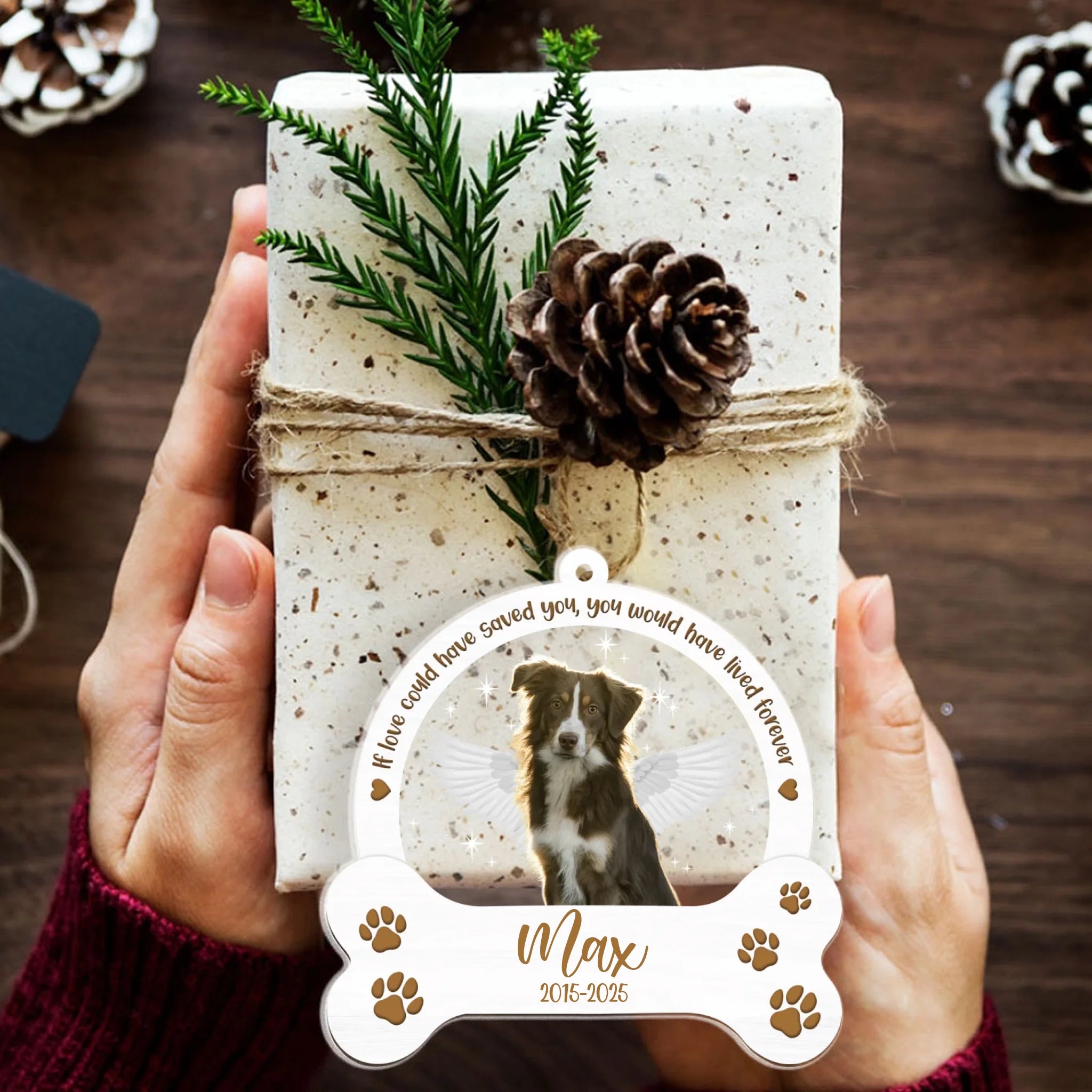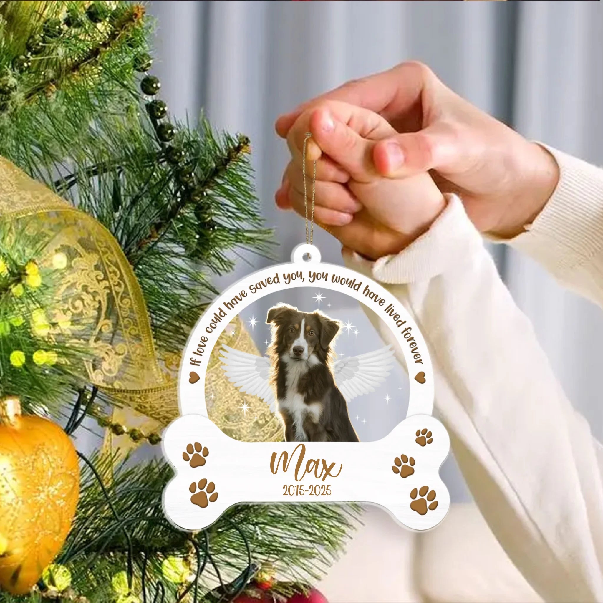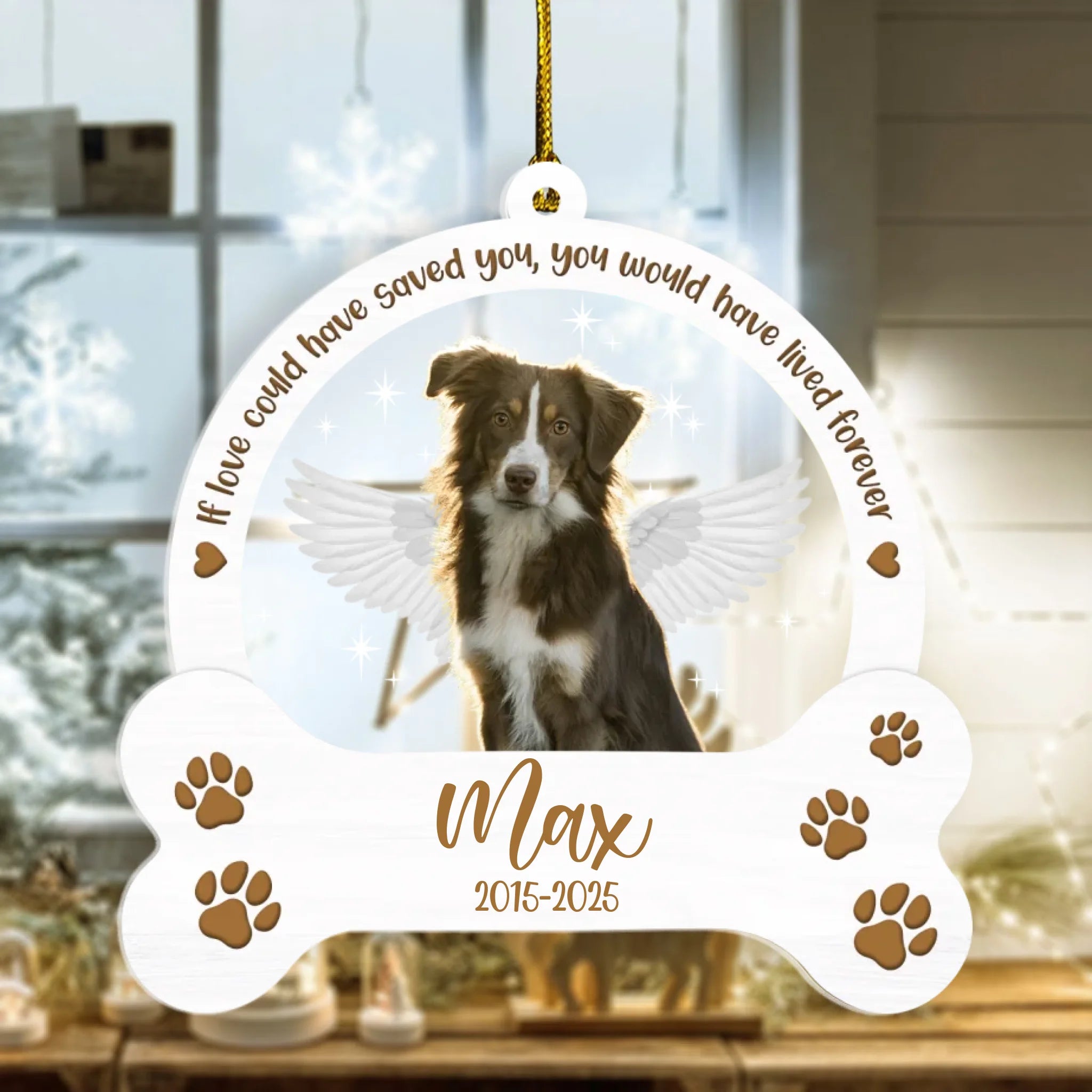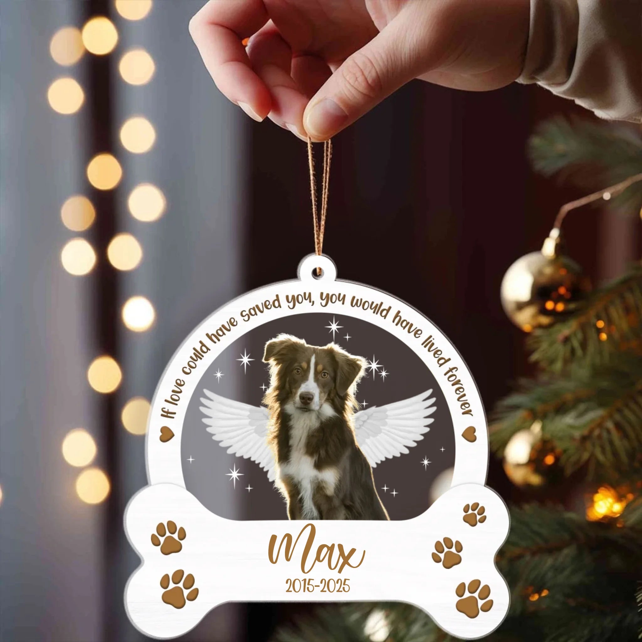 Featuring your dog’s photo, name, and life years surrounded by the touching quote “If love could have saved you, you would have lived forever,” this ornament is a heartfelt way to keep their spirit close. With angel wings and paw prints on a crystal-clear acrylic surface, it’s a timeless keepsake to cherish the love that never fades.