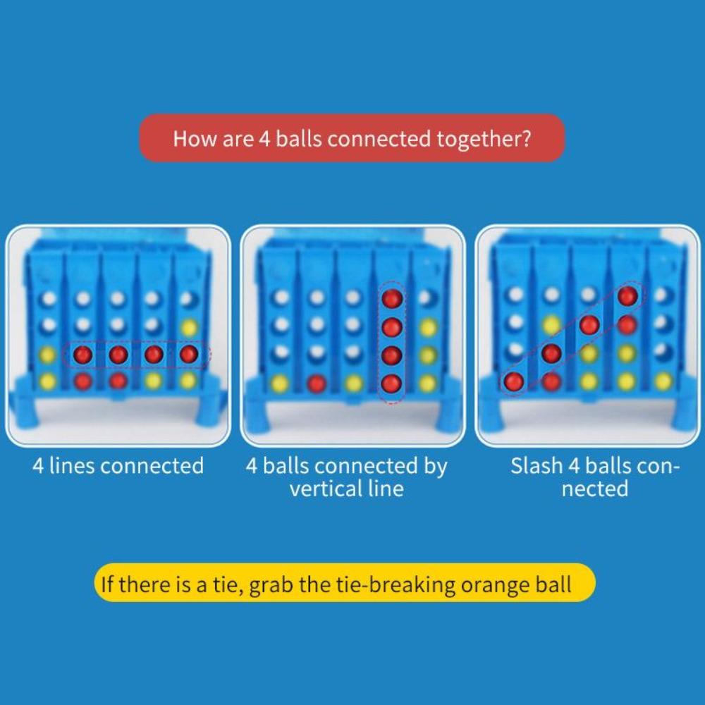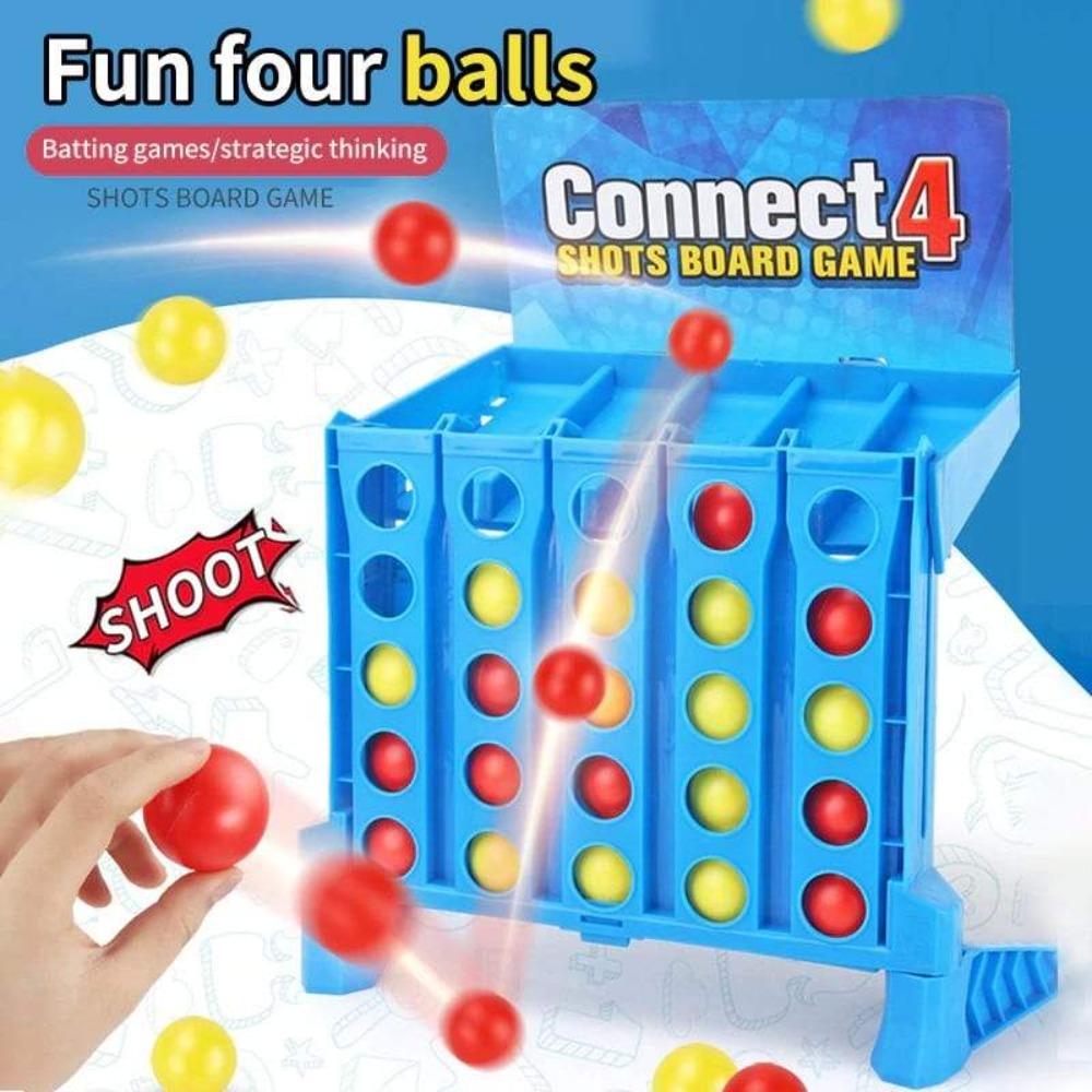 El juego de conectar 4 tiros necesita que el ganador obtenga la línea de bola del mismo color en la cuadrícula de bolas de juguete. Dos jugadores, cada uno con una bola de un color. Los jugadores intentan lanzar la pelota sobre el escritorio y dejar que se refleje en la pendiente deslizante. Por fin la bola rueda hacia la red. Cada jugador se turna para lanzar la pelota.