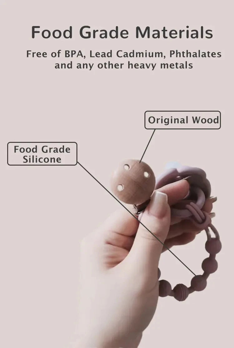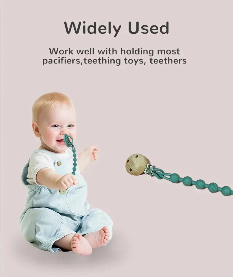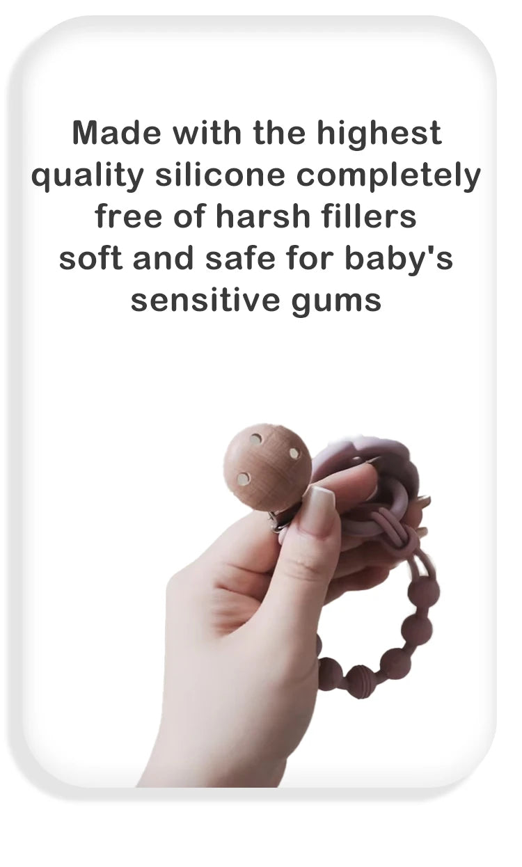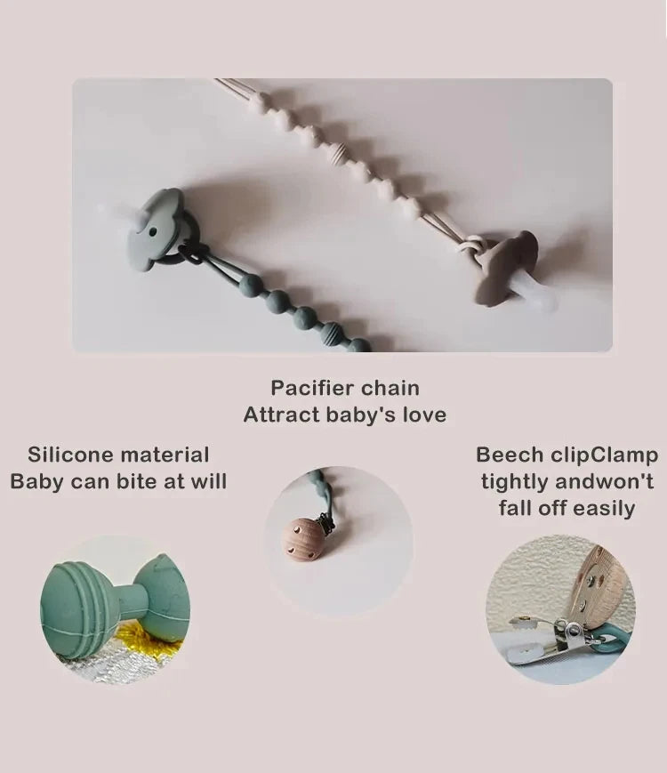 Uso versátil: Más allá de ser un soporte para chupete, también funciona como pulsera mordedora, lo que brinda exploración sensorial y alivio de la dentición de su bebé.