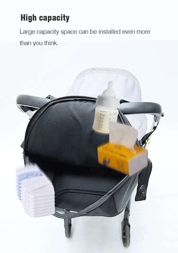 Lo mejor de la versatilidad: no es solo un bolso para cochecito: este accesorio versátil se adapta a tus necesidades. Desde pañales y toallitas hasta snacks y juguetes, mantén todo a tu alcance. Abrace la libertad de disfrutar de sus salidas sin preocuparse por la desorganización.