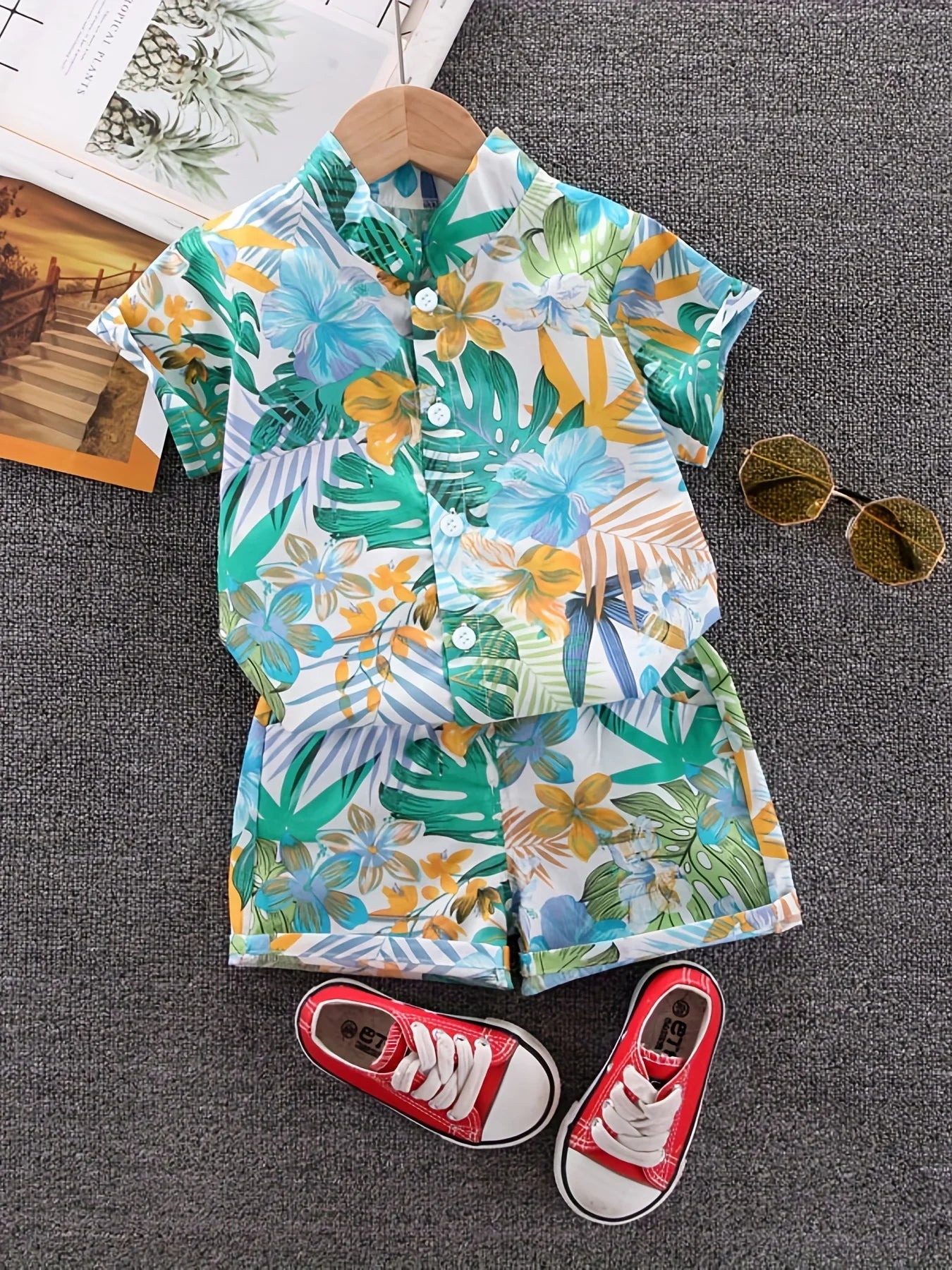 ¡Presentamos nuestro cautivador conjunto de manga corta con estampado de hojas y flores de verano para niños!