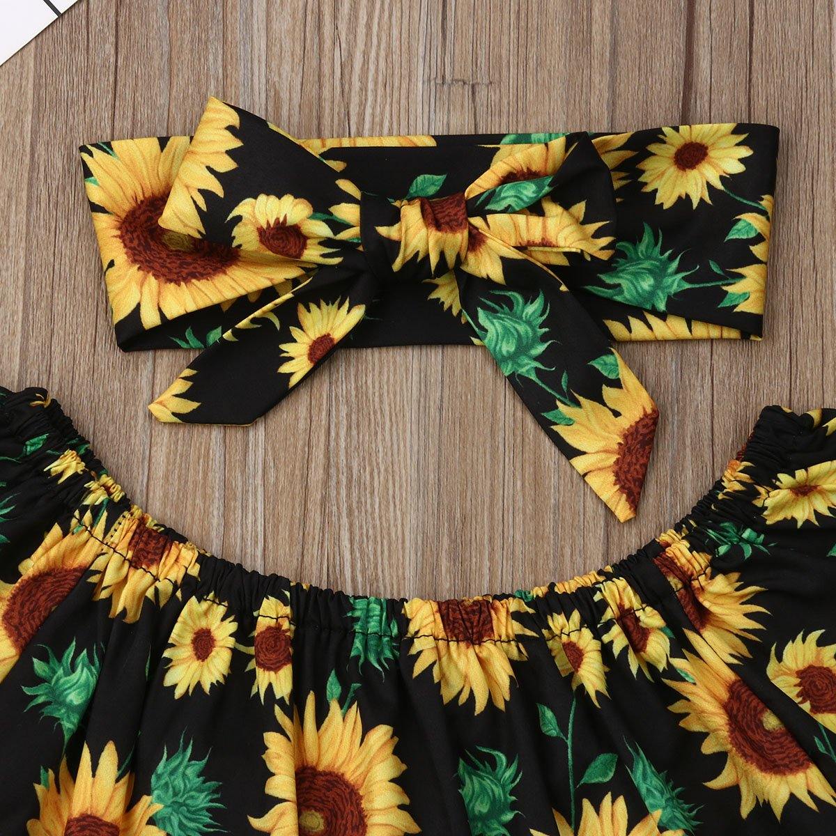 Sunflower Summer Outfit is the ideal dress for baby girls to carry in the summer season. It has an off-shoulder top with a matching headband and ripped jeans. The sunflower print on the top is bright and seems lively giving a cheerful vibe in summer. The top has an off-shoulder neckline with short bell sleeves that provide a stylish design cut to the top. The cotton material of the top is super soft and comfortable to wear. The loose fit of the top makes the top airy and breathable. When paired with ripped jeans and the matching bow headband, the complete outfit looks fashionable and season trendy.