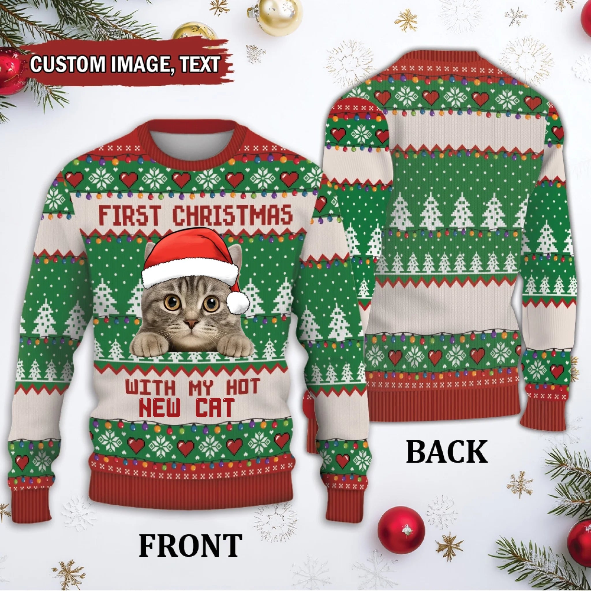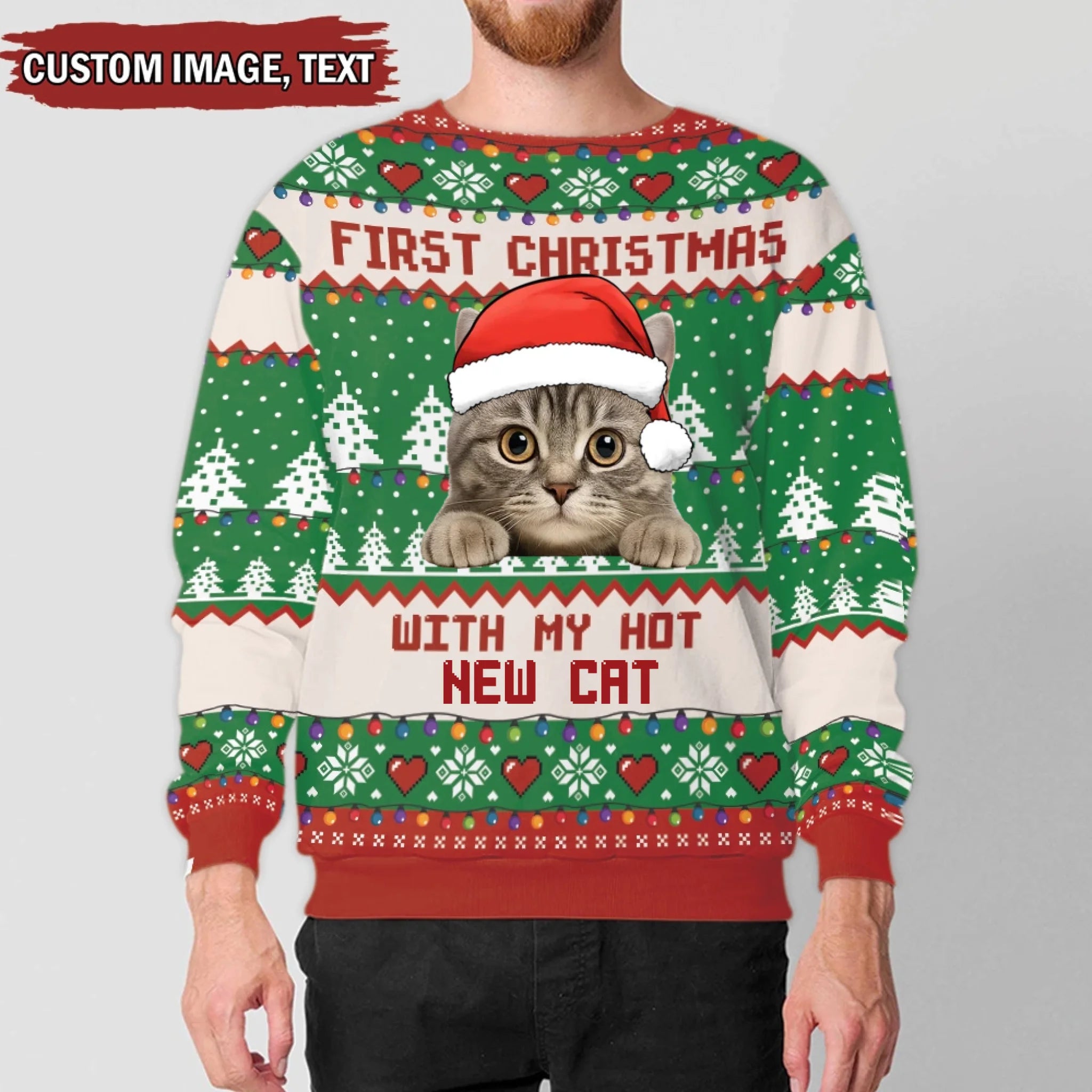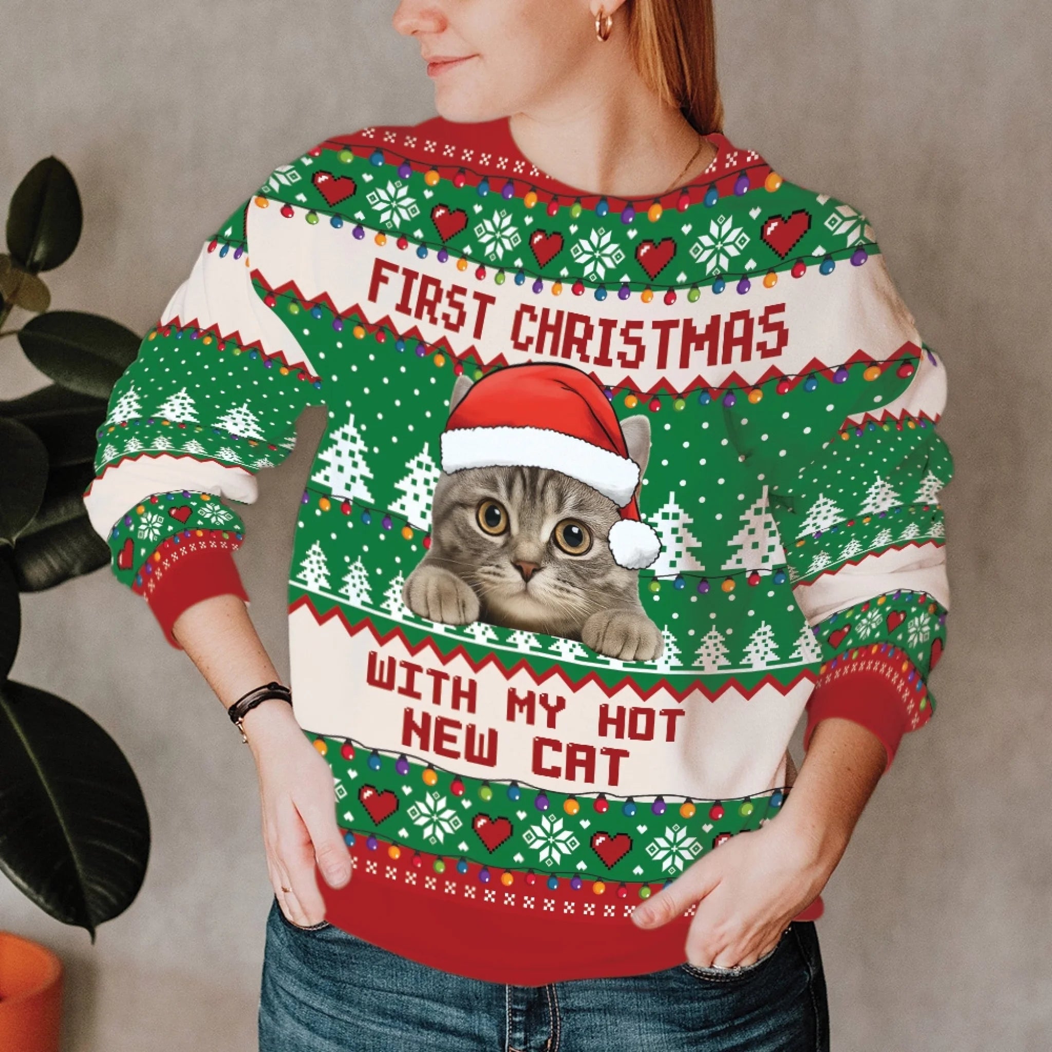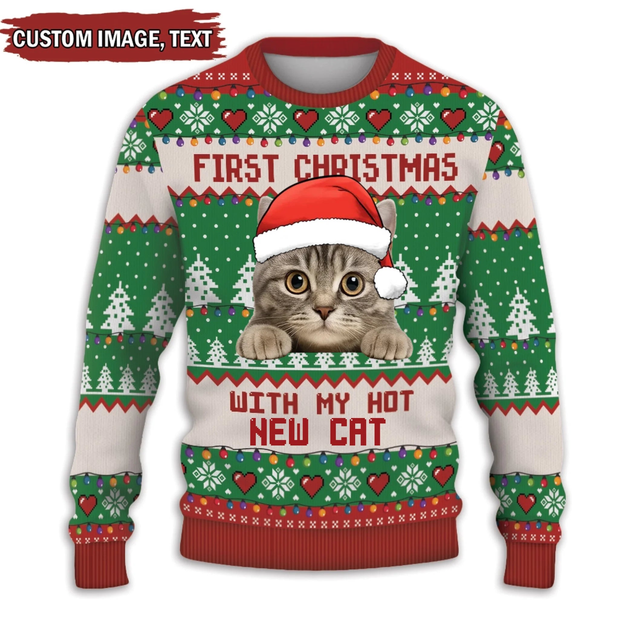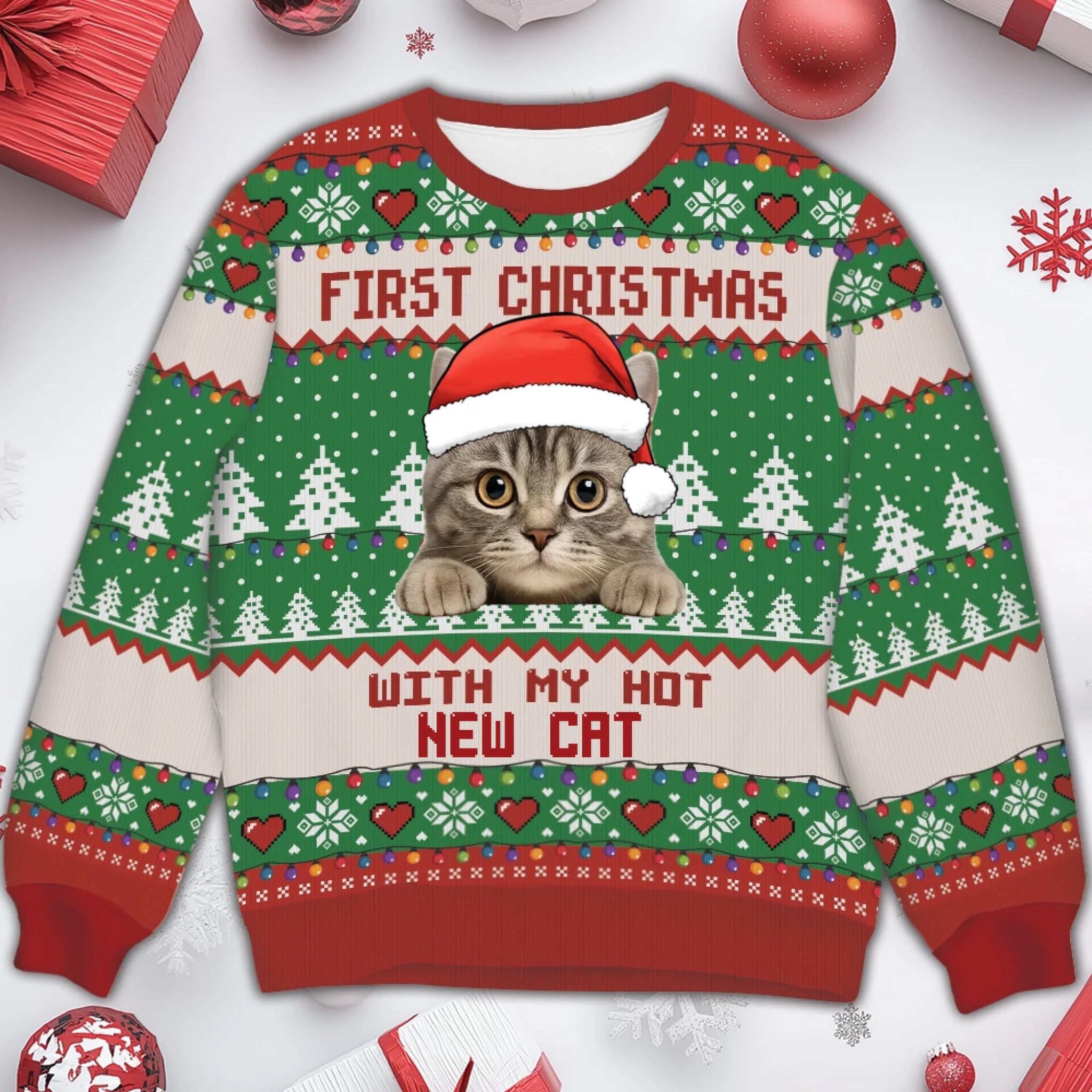 Christmas sweater with a cat wearing a Santa hat and text 'First Christmas with my hot new cat' on a festive background.