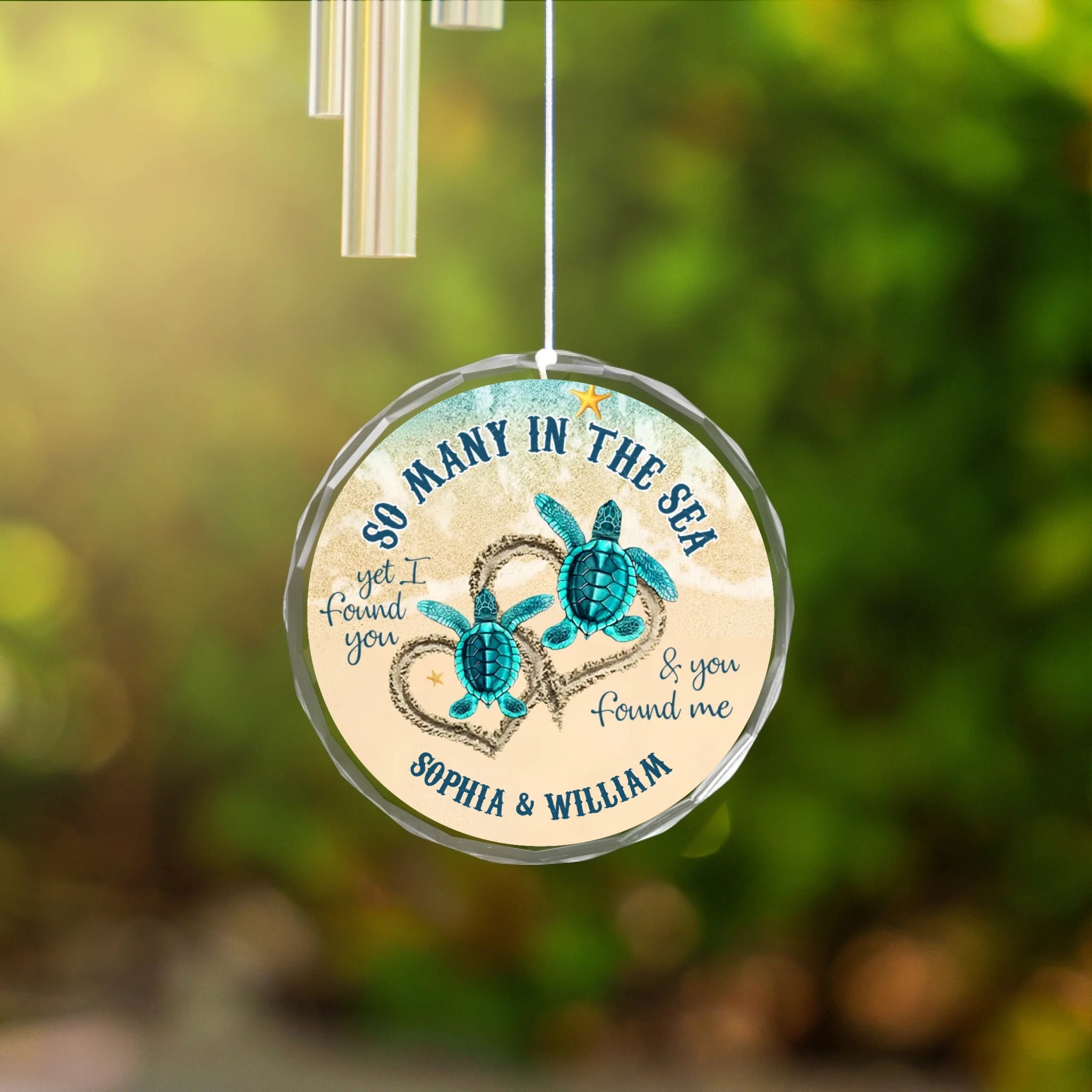 Decorative wind chime with turtle design and personalized text against a green foliage background
