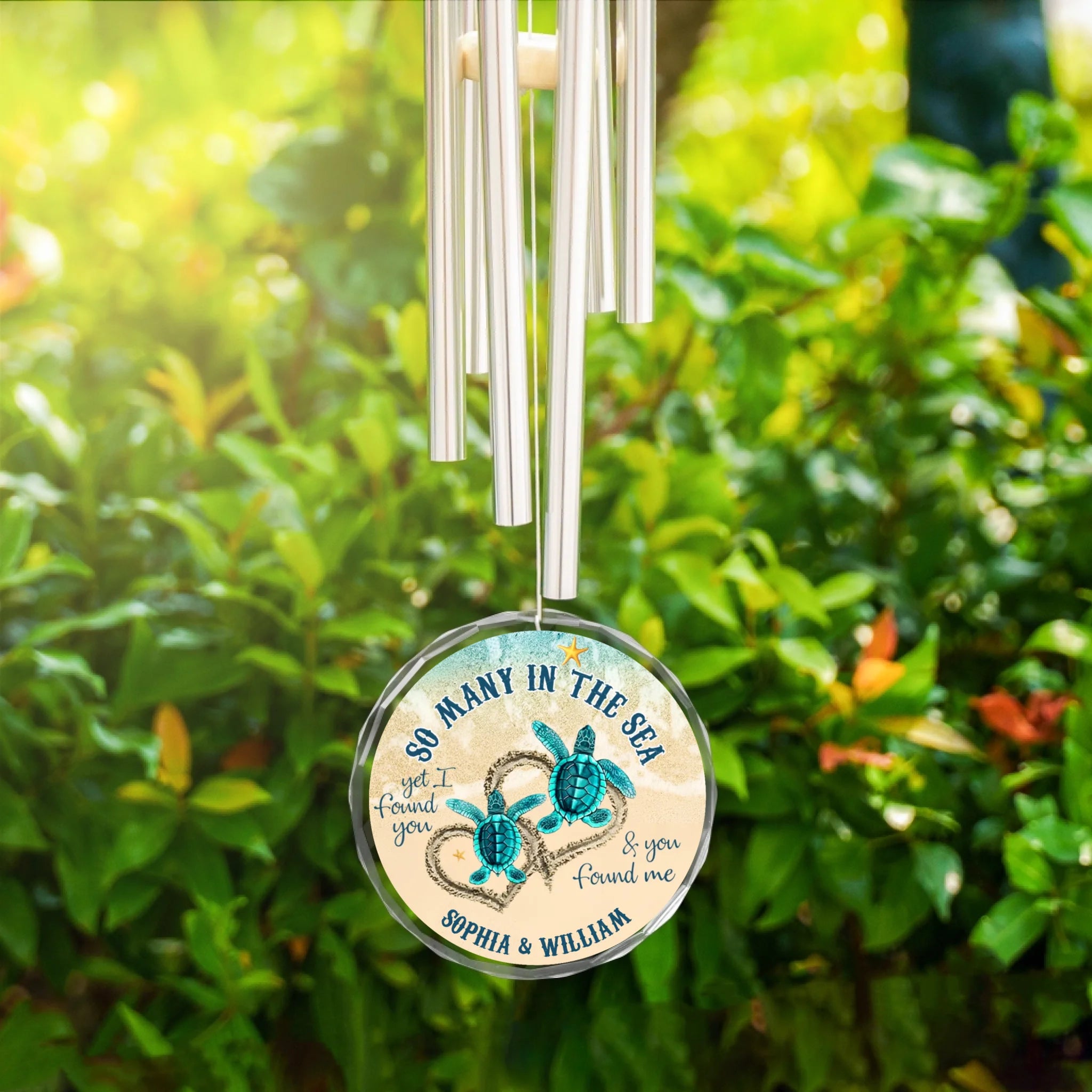 Wind chime with turtle design and personalized text hanging among green leaves.