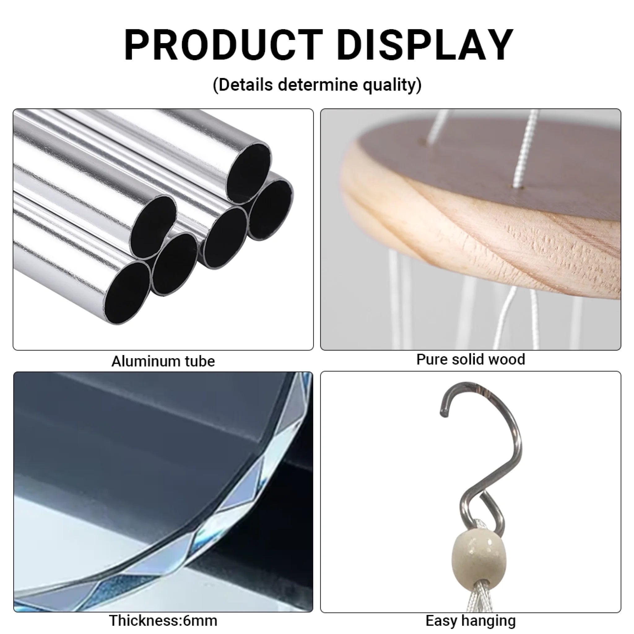 Product display with aluminum tubes, solid wood, glass thickness, and a hook.