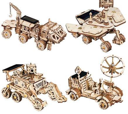 El kit de construcción de modelos de energía solar es un modelo espacial de madera que funciona 100% con energía solar. Está inspirado en el vehículo de exploración espacial de la NASA y combina conceptos STEM. La misión es explorar la existencia de seres vivos en otros planetas. También analiza el clima y la geología.